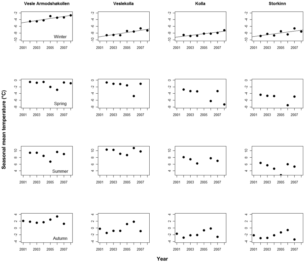 We found significant, positive trends in mean monthly temperatures in nine of the 16 logger time series after correcting for seasonal effects, in three time series at Vesle Armodshøkollen (N,E,S), in four at Veslekolla, and in one at each of Kolla (N) and Storkinn (S). One time series at Storkinn (E) was ended in 2005 due to logger failure, while we found no trends in the remaining six time series (results not shown). When looking at the four seasons separately for the logger data, only winter temperatures showed positive trends (Figure 3).