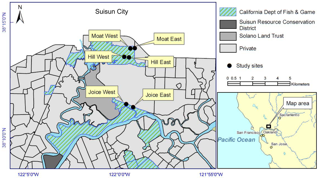 21. CDFG. Vegetation Mapping of Suisun Marsh, Solano County: A report to the California Department of Water Resources; Wildlife and Habitat Data Analysis Branch: Sacramento, CA, USA, 2004. [Google Scholar]