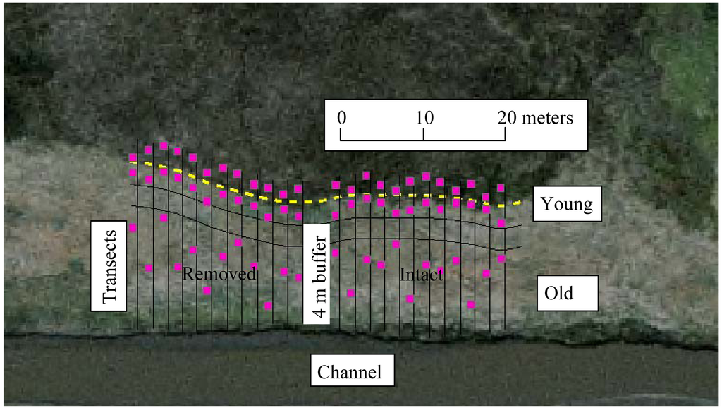Each perennial pepperweed-dominated site was divided into strata according to invasion age. Based on previous studies, both in Suisun marshes [21,31,36] and other similar ecosystems [31,35], undisturbed perennial pepperweed populations tend to expand from the point of establishment (usually along a waterway) outward at a predictable rate of 1–2 m per year, regardless of moderate variations in inundation, elevation, soil properties, or plant communities [19,21,23,35]. To confirm this in the polygons selected for this study, we used a GIS (Geographic Information System) to measure the expanding edges in 1999 and 2003, and compared these measurements with field measurements in 2006. We then measured back from the expanding edge of each colony to predict approximate age (time since initial invasion). A species accumulation curve [45] was determined at a representative site to estimate the number of sample quadrats per vegetation stratum. A 4-m buffer area divided each site in half (Figure 2). Parallel transects (n = 24), spaced 2 m apart, were set through a gradient from lowest to highest perennial pepperweed cover and density, dividing the site into three strata: non-invaded, sparsely-invaded (“young”; younger than three years and less than 3 m from the expanding edge, average perennial pepperweed cover 20% and average density 19.6 stems/m2), and densely-invaded (“old”; older than 3 years and greater than 6 m from the expanding edge, average perennial pepperweed cover 80% and average density 68.8 stems/m2). A randomly selected 1 m2 plot was established along each transect in each of the three strata for a total of 72 plots per site. Means of the dependent variables within each treatment were used for analyses.