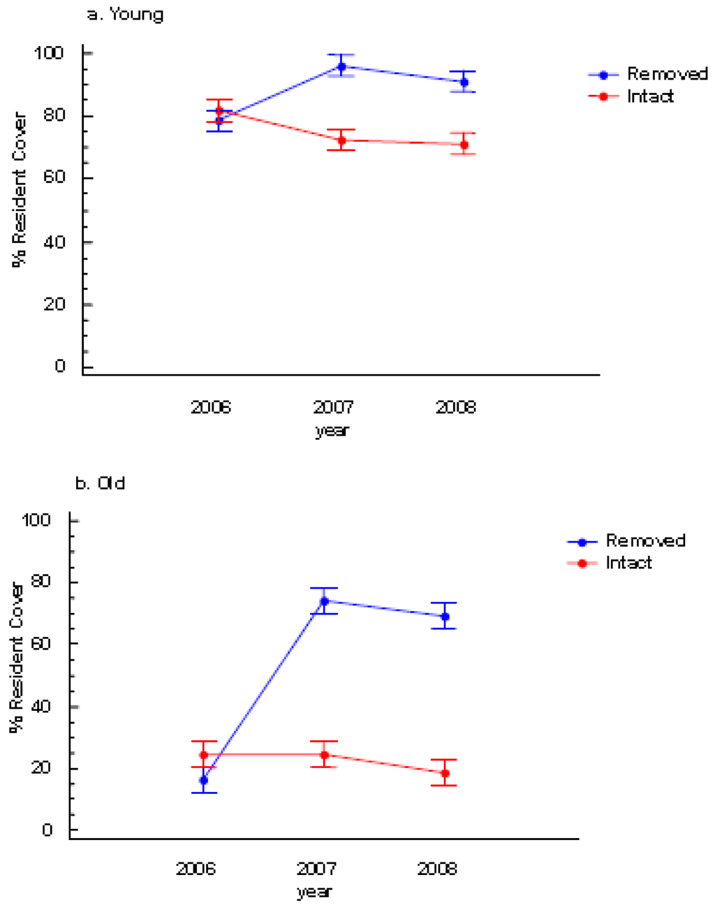 Figure 3. Resident plant species cover (%) in 2006, 2007, and 2008, before, 1, and 2 years after perennial pepperweed removal, in young (a) and old (b) strata, where perennial pepperweed was either removed or left intact. Bars are ±95% confidence intervals.