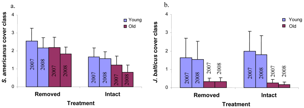 Figure 4. Average cover class of Schoenoplectus americanus (a) and Juncus balticus (b) in 2007 and 2008, 1 and 2 years after perennial pepperweed removal, in young and old strata, where perennial pepperweed was either removed or left intact. Cover classes 1–4 correspond to <1%, 1–5%, 6–15%, and 16–25% cover, respectively. Bars are ±95% confidence intervals.