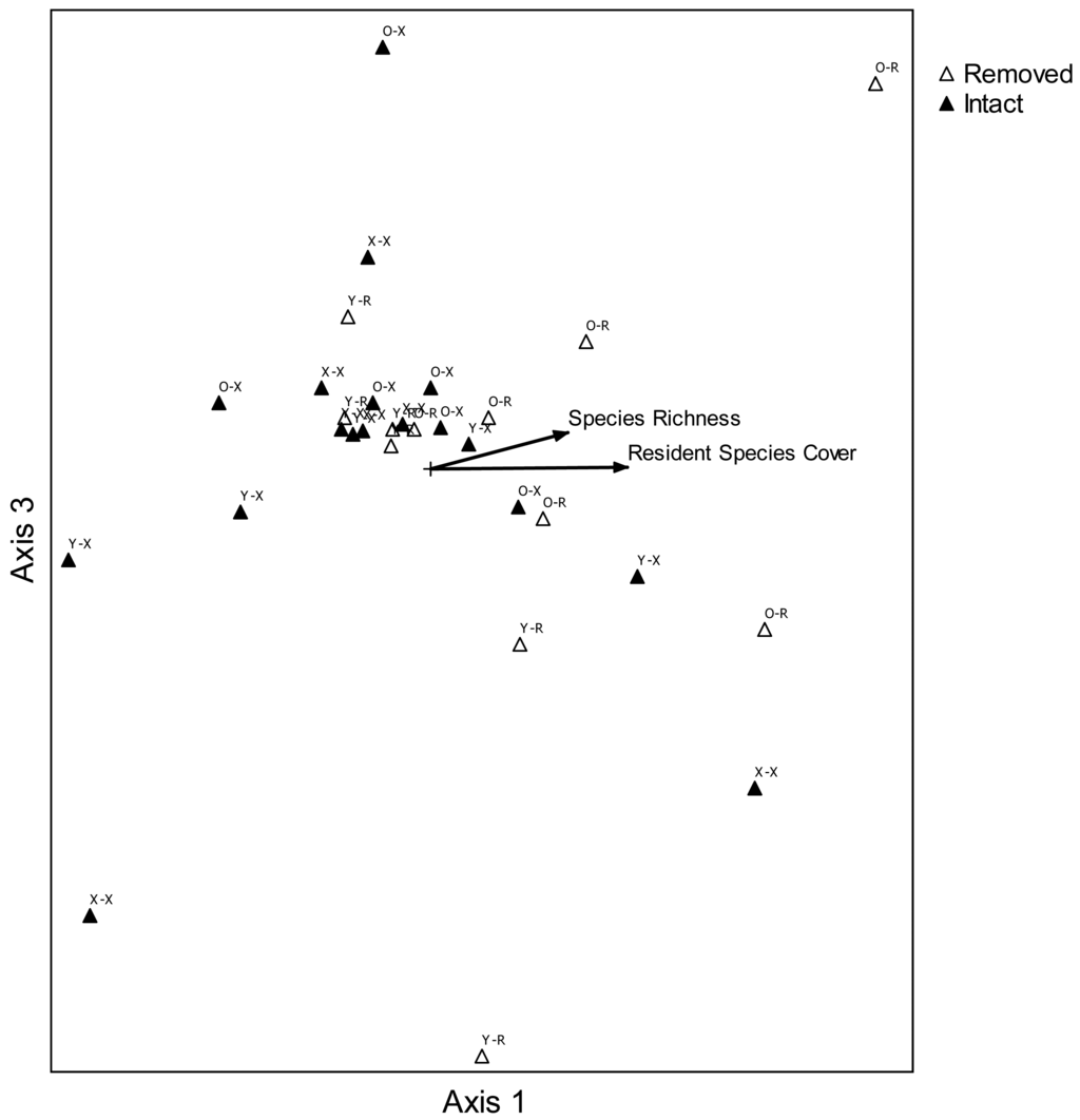 Figure 5. NMDS (nonmetric multidimensional scaling) for variable combinations in resident species space reflecting change in species composition two years after treatments. Labels for treatment combinations are as follows: the first letter refers to stratum age of perennial pepperweed (Y = young, O = old, X = non-invaded), and the second letter refers to perennial pepperweed removal (R, open triangles = removed; X, closed triangles = intact). Each combination is represented six times for the six sites.