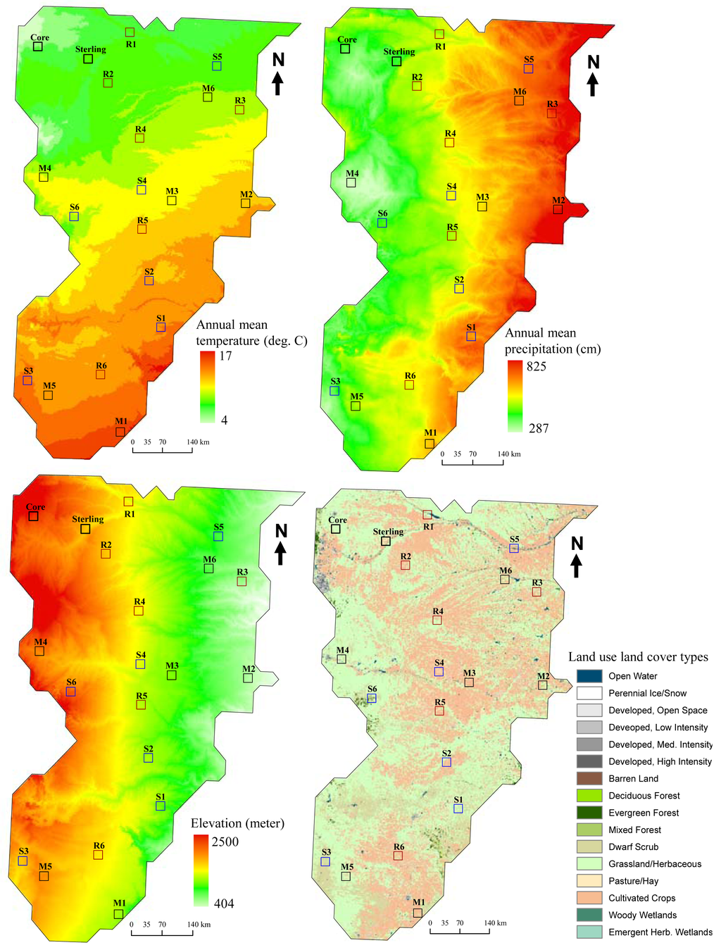 The predominant vegetation at the core site is C4-dominated native shortgrass steppe, and a variety of other communities in the domain (e.g., southern mixed grass and cool season species) are also present. The climate at the core site is characterized by low precipitation, periodic water deficits, and large interannual and interseasonal climatic fluctuations. Most (70%) of the annual precipitation is derived from the Gulf of Mexico and falls during the warm season between April and September. However, mean temperature and precipitation, elevation, and vegetation are highly variable across the domain (Figure 1). It is clear that additional ecological observatory sites will be needed to capture the major environmental gradients and heterogeneity across the domain.