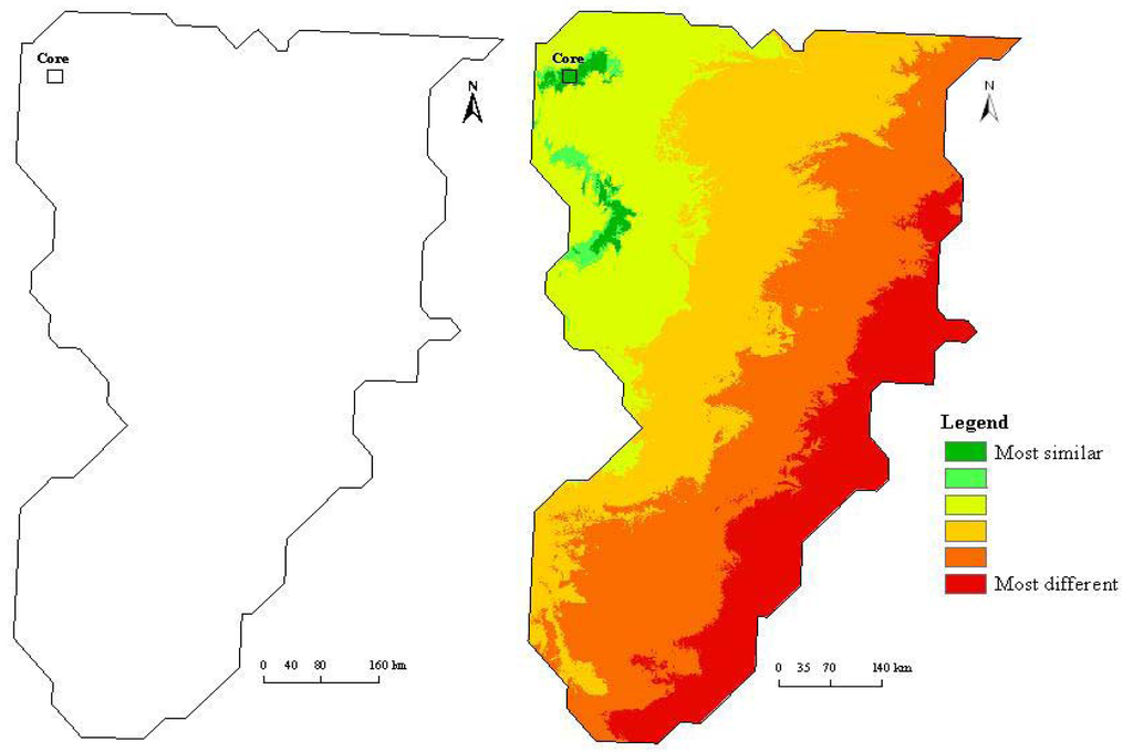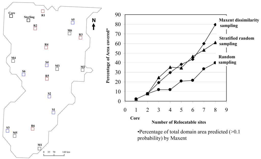 Where costs are an overriding concern, designers might ask: What are the minimum number of sample sites needed to adequately represent the majority area and environments of a region? We propose that maximum entropy modeling, often used for species-environmental matching or “niche” models [3–5], might be useful. Species-environmental matching models typically relate species occurrences to environmental predictor variables. They define and map suitable habitat compared to unsuitable habitat, often referred to as the environmental envelope of a species. The models use various algorithms to model the distribution of the known locations (response variable), select significant predictor variables and determine their fit, evaluate the strength of association between predictors and response, and predict habitat suitability in areas where the distribution is unknown [6,7]. The models have been used to successfully quantify the environmental niche of a species [3,5,6], predict species invasions [8], estimate species distributions in future climates [9], and in conservation planning and reserve selection [10,11].