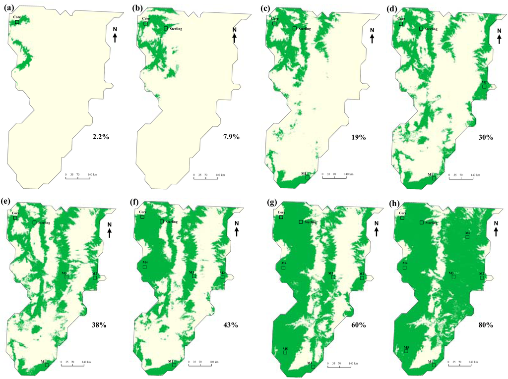 The question remained, where should the third, fourth, fifth, and so on, sites be located to adequately capture the heterogeneity of the domain? Locating the third site according to model-directed habitat dissimilarity in the southeast portion of the domain resulted in a model that captured about 19% of the domain in the environmental envelope of the sites (Figure 3c) as compared to just 2.2% (Figure 3a), and 7.9% (Figure 3b), after the first two runs.