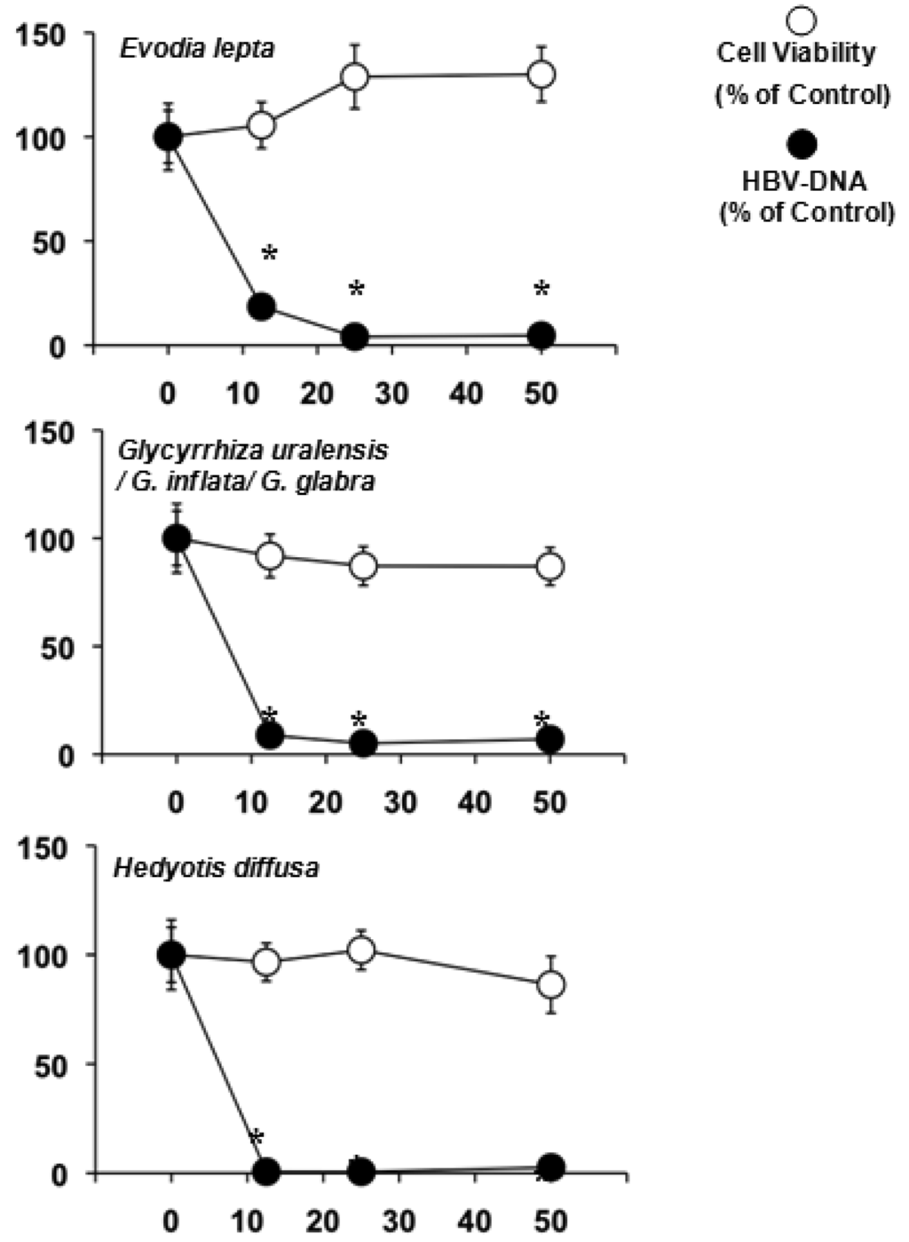 The water extracts were also screened against HBV in HepG2 2.2.15 cells (Table 3). Evodia lepta, Hedyotis diffusa and several Glycyrrhiza species lowered the HBV-DNA significantly and were not toxic to the HepG2 2.2.15 cell line (Figure 1).