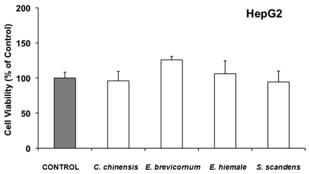 In HepG2, none of the 4 extracts with ability to inhibit cell growth (Coptis chinensis, Epimedium brevicornum, Equisetum hiemale and Senecio scandens), were found to induce acute cell toxicity when they were incubated with the IC50 of the extracts for 6 h (Figure 2).