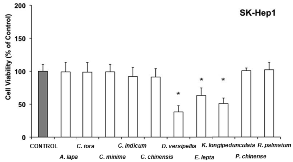 In SK-Hep1, among the 10 extracts with antitumor effect 7 did not induce acute toxicity (Arctium lappa, Cassia tora, Centipeda minima, Chrysanthemum indicum, Coptis chinensis, Phellodendron chinense and Rheum palmatum), whereas Dysosma versipellis was especially active by lowering the cell viability in comparison to the control to 40% (Figure 3). This is consistent with the inhibitory effects known for the lignans of D. versipellis against prostate cancer cell lines [].