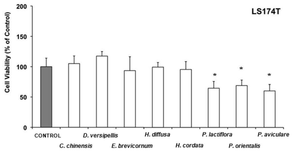 Evodia lepta and Kadsura longipedunculata lowered also the cell viability of SK-Hep1 in comparison to the control to 50-60%. Recently, it has been reported that the essential oil of Kadsura longipedunculata and its major components (delta-cadinene, camphene, borneol, cubenol, and delta-cadinol) have some degree of cytotoxic activity against some human cell lines []. In LS 174T cells, water extracts from Coptis chinensis, Dysosma versipellis, Epimedium brevicornum, Hedyotis diffusa and Houttuynia cordata have antiproliferative effects without affecting cell viability (Figure 4), whereas Paeonia lactiflora, Platycladus orientalis, and Polygonum aviculare, in addition to inhibition of cell growth were able to acutely lower cell viability in comparison to the control to 60–70%.