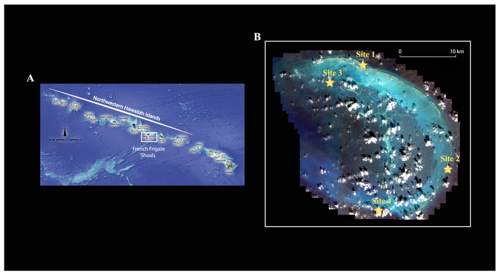 Because crustaceans represent a large part of the invertebrate fauna associated with coral reefs, are the second most diverse group of marine multicellular organisms [9] and are relatively easy to DNA barcode, we chose to focus on this group for this study. We compared the crustacean diversity from three distinct reef habitats (lagoonal patch reef, backreef and forereef) at French Frigate Shoals, an open-atoll reef system in the Northwestern Hawaiian Islands. French Frigate Shoals is the largest atoll in the Northwestern Hawaiian Islands (Figure 1A). It consists of a 32 km long crescent-shaped reef. The total land area of the islets is 248,910 m2 and the total coral reef area of the shoals is over 940 km2.