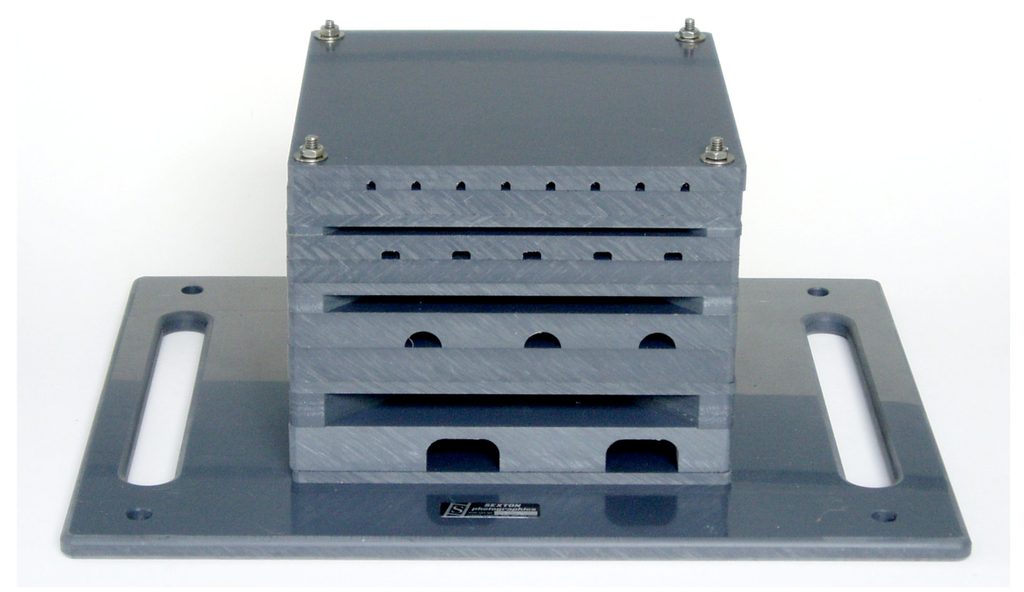 The prototype ARMS used in this study consisted of stacked PVC layers with different sized and shaped openings that allow organisms to settle or shelter within the structure (Figure 2). Each of the ARMS were 35.5 cm × 45.7 cm × 20.3 cm. Layers (22.8 cm × 22.8 cm) include flat sandwich and layers with holes of varying sizes ranging from 1.9 cm to 0.5 cm height. The ARMS in this study were deployed in October 2006. Three ARMS, several meters apart, were deployed per site. As four different sites were investigated, the total number of ARMS was 12. The ARMS were retrieved the following year (September 2007).