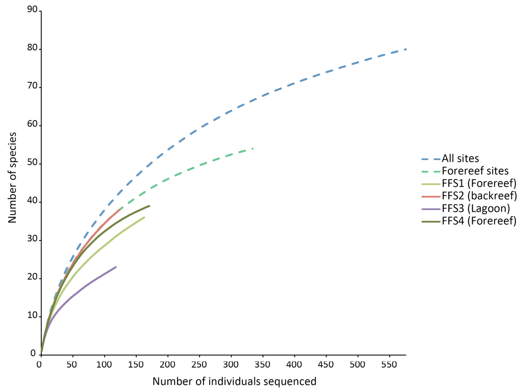 The lowest number of species was observed on the lagoonal patch reef (23 species, four singletons) (Table 2). The remaining habitats had similar, higher total numbers of species (backreef: 38 species, nine singletons; forereef-site 1:36 species, eight singletons; forereef-site 4:40 species, two singletons). When the data are normalized to eliminate potential biases due to the different numbers of individuals collected for the four sites, by randomly taking 100 sequences 100 times, the rank order of diversity was backreef, the two forereef sites, and the lagoonal patch reef (34, 29, 32, and 21 species, respectively).