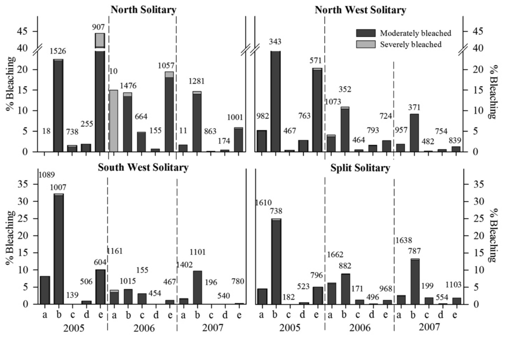A total of 83,951 individual coral colonies were counted at the eight sites investigated between 2005–2007, of which 2,950 and 138 colonies were recorded as moderately and severely bleached, respectively. Overall, the proportion of total bleached coral colonies (moderate and severe categories combined) within each location varied between 4 to 16% during all summer surveys. The highest proportion of colonies noted as moderately bleached was recorded during summer 2005 (11% pooled from all sites); however severe bleaching was greatest during summer 2006 (<1% pooled from all sites). Total bleaching response was highest at Anemone Bay (NSI) during summer 2005, where 22% and 1% of coral colonies were observed with moderate and severe bleaching response, respectively. At the other sites, moderate and severe bleaching ranged between 6 and <1% (SSI-Coral Corner) and 12 and 1% (NSI-Trail Mooring), respectively. Total bleaching response during summer was highest at NSI compared to the more southern nearshore island reefs (Figure 2).