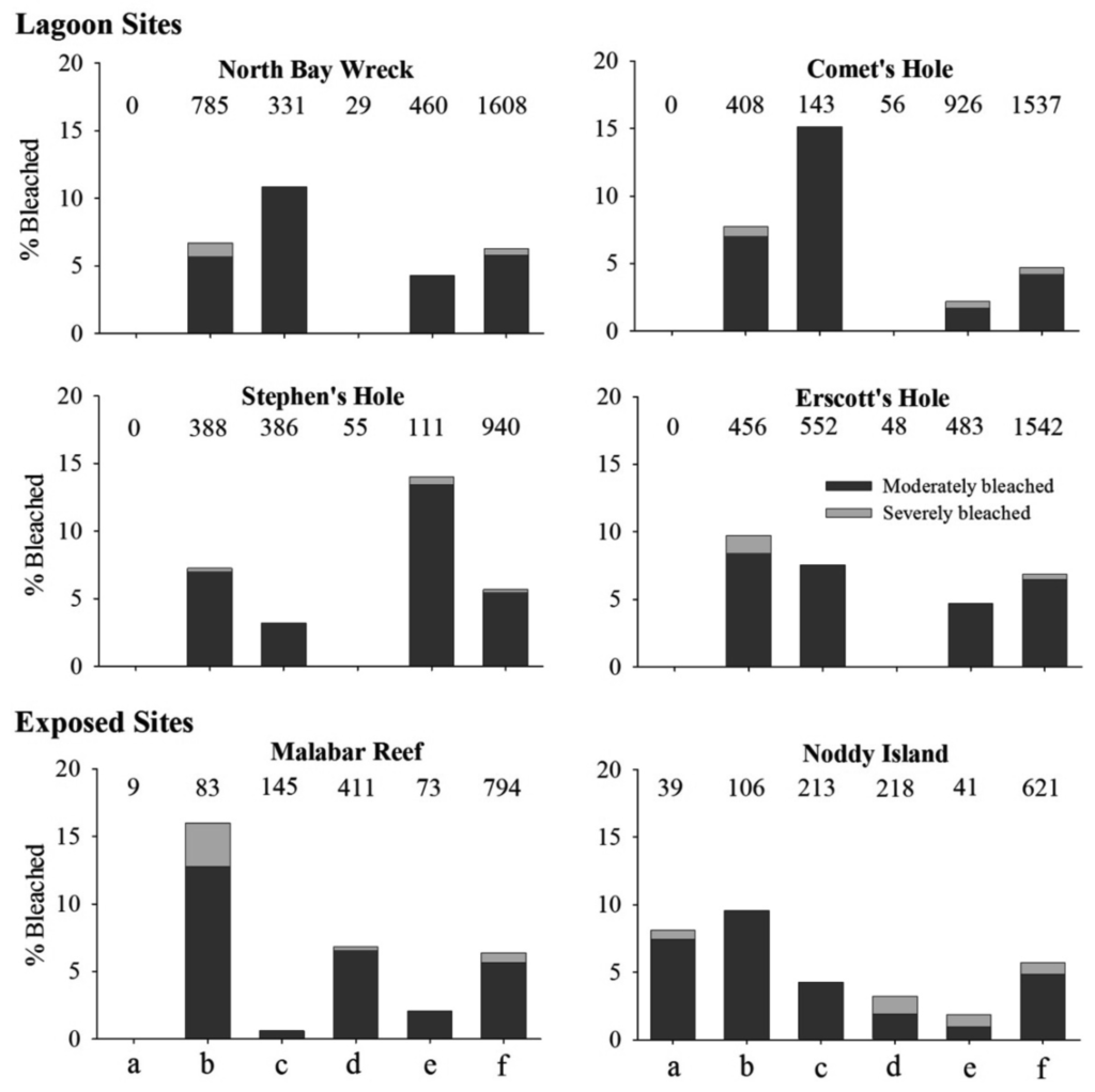 A total of 7,042 individual colonies from eleven scleractinian families were recorded at the six sites evaluated, of which 396 (5.74%) were observed with varying degrees of pigmentation loss. The mean proportion of moderate bleaching was an order of magnitude higher than the mean proportion for the severe bleaching category. The total proportion of bleached colonies ranged between 4.68% at Comet's Hole and 6.36% at Erscott's Hole. Overall, five hard coral families (Acroporidae, Dendrophylliidae, Faviidae, Pocilloporidae, and Poritidae) were observed with reduced pigmentation (Figure 4). Bleaching was present in acroporids at all sites and ranged between 0.61 and 15.13%. Poritids and pocilloporids were observed with varying degrees of pigmentation loss at all sites. The highest bleaching response was within the pocilloporids at the exposed Malabar Reef, where 12.77 and 3.22% of this population were moderately and severely bleached, respectively.