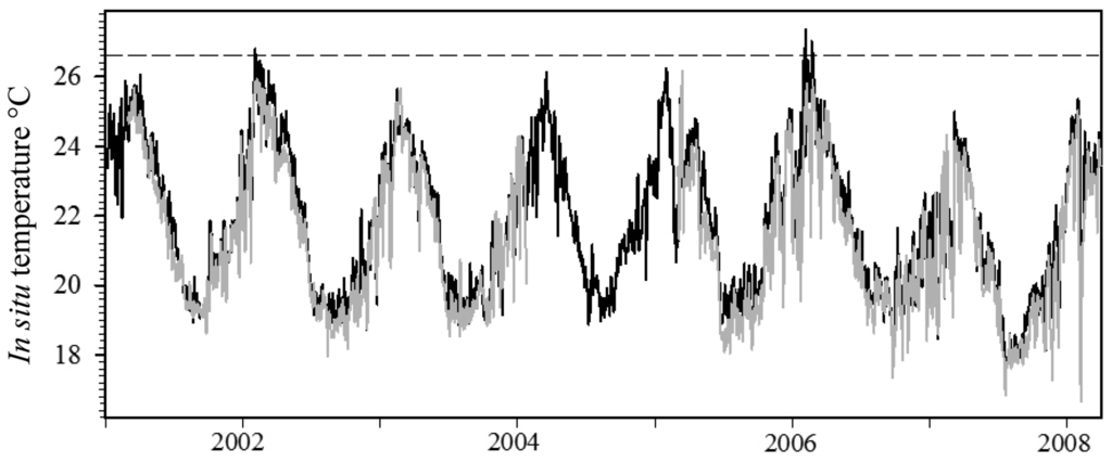 Weekly temperature fluctuations of up to 5 °C occurred consistently at the midshelf island reefs (SWSI and SSI), with an 8.4 °C differential observed at SWSI during a one-week period (Figure 5; 31 January 2008–7 February 2008). Daily temperature changes up to 4 °C day−1 were common at all locations during summer months. Summer seawater temperatures were highest during 2006 at all locations, and average daily temperature exceeded 27 °C on three occasions at NSI. However, the number of days seawater temperature exceeded 25 °C was greatest during 2002, where 52 and 33 days exceeded this measure at NSI and SWSI, respectively (Table 1). Maximum monthly mean temperatures occurred during February and March during most years at all island locations (Table 1). At NSI this measure was highest in 2006, but was highest during February 2002 at the midshelf islands.