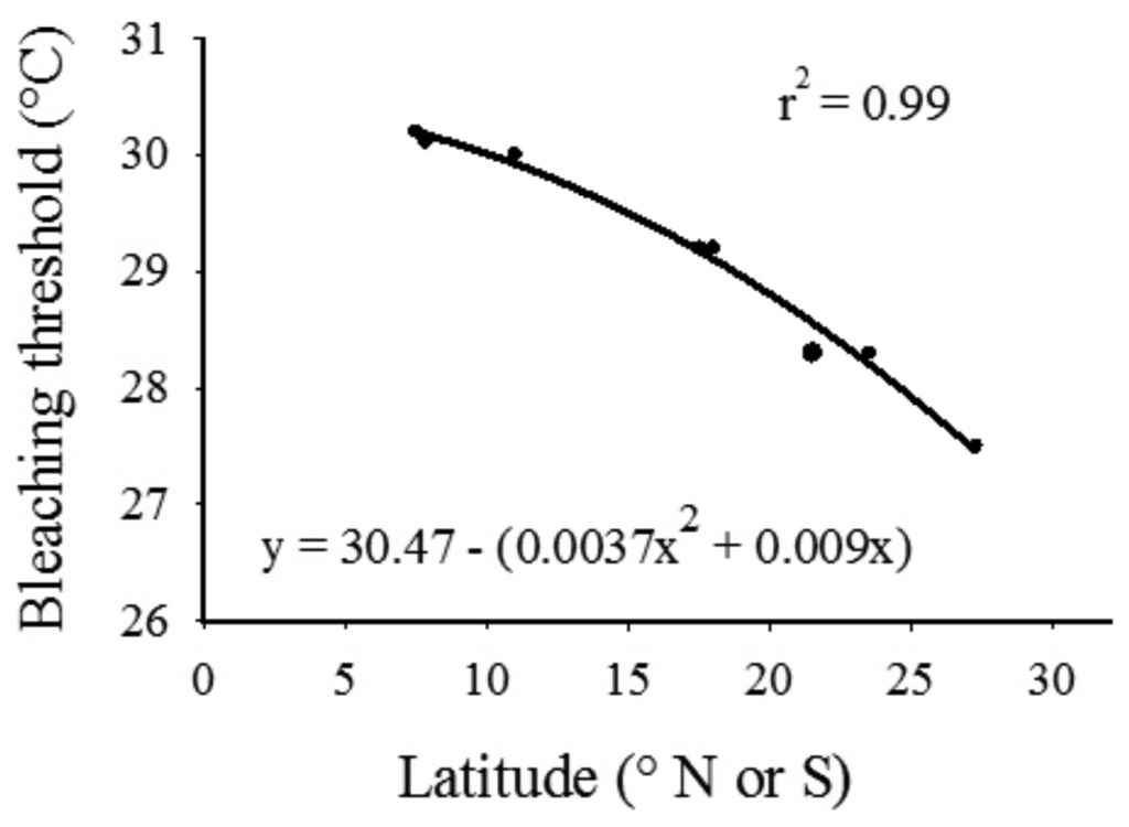 Manzello et al. [48] tested the effectiveness of nine thermal indices to predict bleaching response at several locations along the Florida Keys Tract. They concluded that maximum monthly SST and the number of days above the predicted thermal threshold was the most accurate predictor of past bleaching patterns. They also reported similar trends when regressing bleaching curves with latitude and seasonal maximum SST. Other factors however, such as local small-scale temperature variations, differences in local seasonal climatic conditions, temperature history [48] and turbidity [49], also require interpretation and inclusion into the aforementioned bleaching model. Nevertheless, the high latitude bleaching model presented in this study provides a useful framework from which to advance studies on bleaching response at finer spatial scales, particularly in the context of local oceanographic conditions.