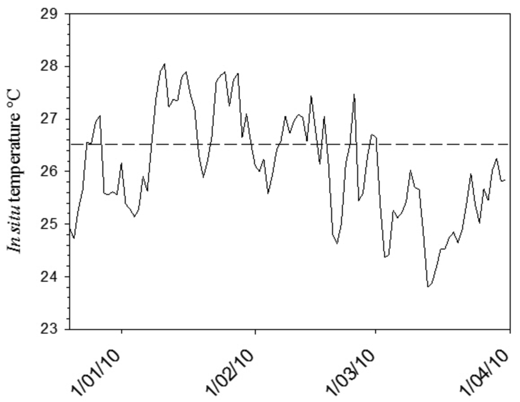 In mid December 2009, seawater temperatures within the LHIMP lagoon began to rise above the predicted thermal threshold level (26.5 °C; Figure 7). A bleaching warning was issued through the NOAA Coral Reef Watch Satellite Bleaching Alert System. During January 2010, a reduction in zooxanthellae pigmentation was observed in many coral species within the lagoon. Quantitative bleaching assessments in March 2010 showed that bleaching ranged between 50–98% within the coral assemblages at five sites within the lagoon [67]. As the bleaching model predicted, Pocilloporid corals (Pocillopora, Stylophora and Seriatopora) and Montipora spp. severely bleached with some bleaching associated mortality observed at several sites. Additionally, Isopora cuneata and Porites spp. displayed variable pigmentation loss [67]. Data collected during the early stages of the 2010 LHI thermal anomaly supports the predictions of the subtropical bleaching model. Further research will investigate the capacity of marginal coral communities to acclimate to future predicted thermal stress events, by quantifying the ability of bleached coral species to shuffle to more thermally tolerant zooxanthellae clades.