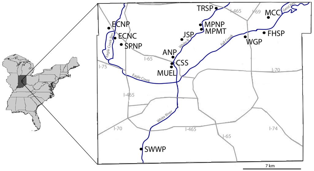 Marion County is located in central Indiana, in the Central Till Plain Section of the Central Till Plain Natural Region [17]. This region is predominated by neutral silt and silty clay loams of the Crosby-Brookston Association. Official government land surveys from 1820–1822 and soil survey records indicate that Marion County was 98% forested in pre-European settlement times [18] (for more information on historical land surveys in Indiana see [19]), with remaining land cover being open water or prairie. Specifically, mesic beech-maple covered 76% of the county, growing over an undissected plain of Wisconsin glacial till with small areas of oak-hickory forest on drier ridges. Northern flatwood communities were found on poorer draining sites, with red maple (Acer rubrum), pin oak (Quercus palustris), swamp white oak (Q. bicolor) and green ash (Fraxinus pennsylvanica) dominating. While in better-drained sites (including slopes around streams), American beech (Fagus grandifolia), sugar maple (Acer saccharum), black maple (A. nigrum), white oak (Quercus alba), red oak (Q. rubra), tulip poplar (Liriodendron tulipifera), black walnut (Juglans nigra), and white ash (Fraxinus americana) were found. Wet-mesic depressional forests were scattered throughout the county with floodplain forests along major rivers and tributaries. Wetlands including ponds, bog, marsh, and fens are estimated to have made up approximately 1% of the original land cover [18]. Most of the region has been greatly disturbed, primarily by ditching and draining of wetter sites, and clearing of forest for row crop agriculture. Barr et al. [18] report recent forest cover in Marion County has been reduced to 13%.