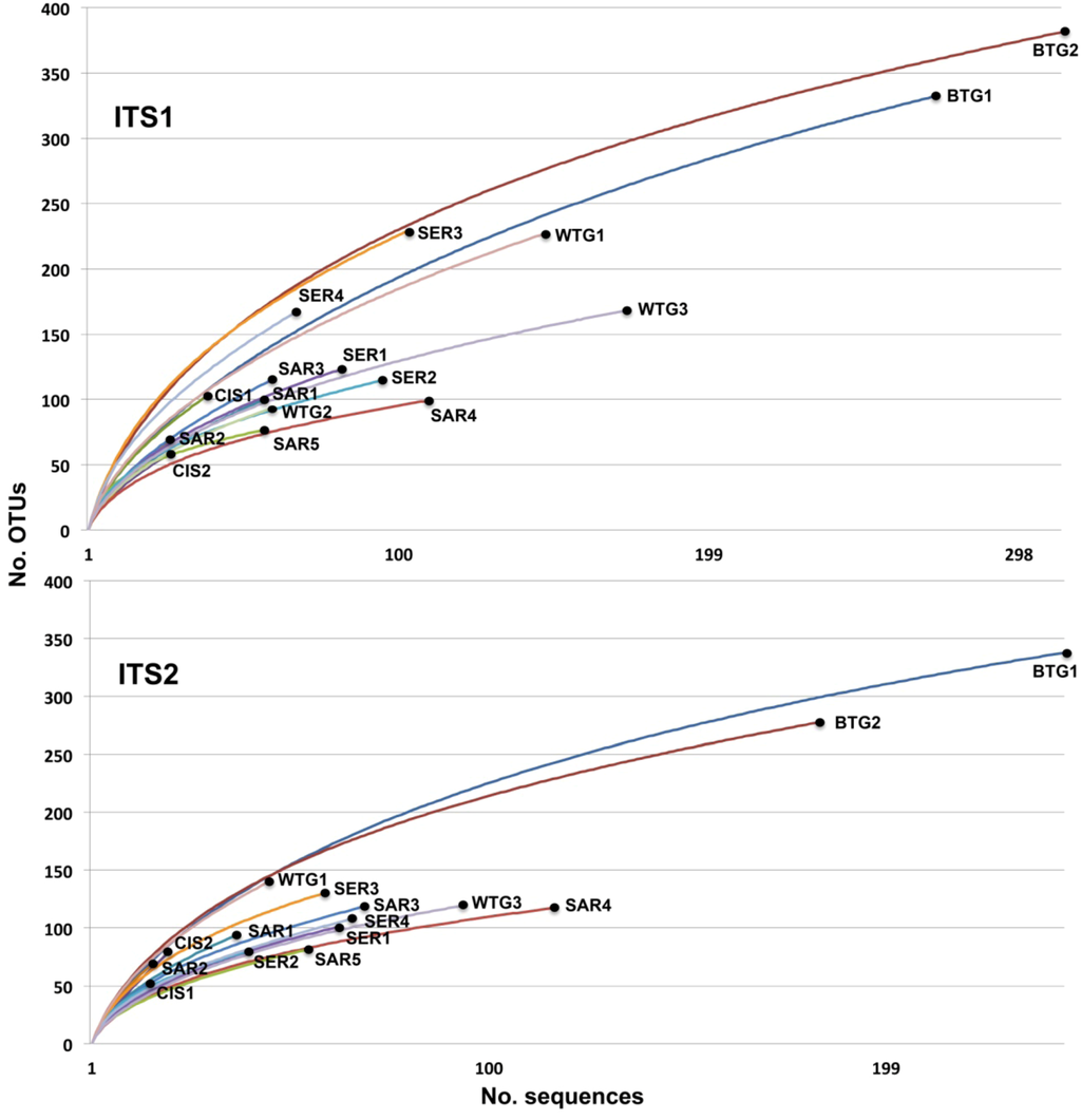 Accumulation curves describing the observed number of ITS1 and ITS2 operational taxonomic units (OTUs) as a function of the sequencing effort per soil plot (rarefaction index values were calculated at intervals of 10 sequences). WTG: white truffle grounds; BTG: black truffle grounds; SAR: Sardinian soils; SER: serpentinitic substrate samples; CIS: contaminated industrial soils.