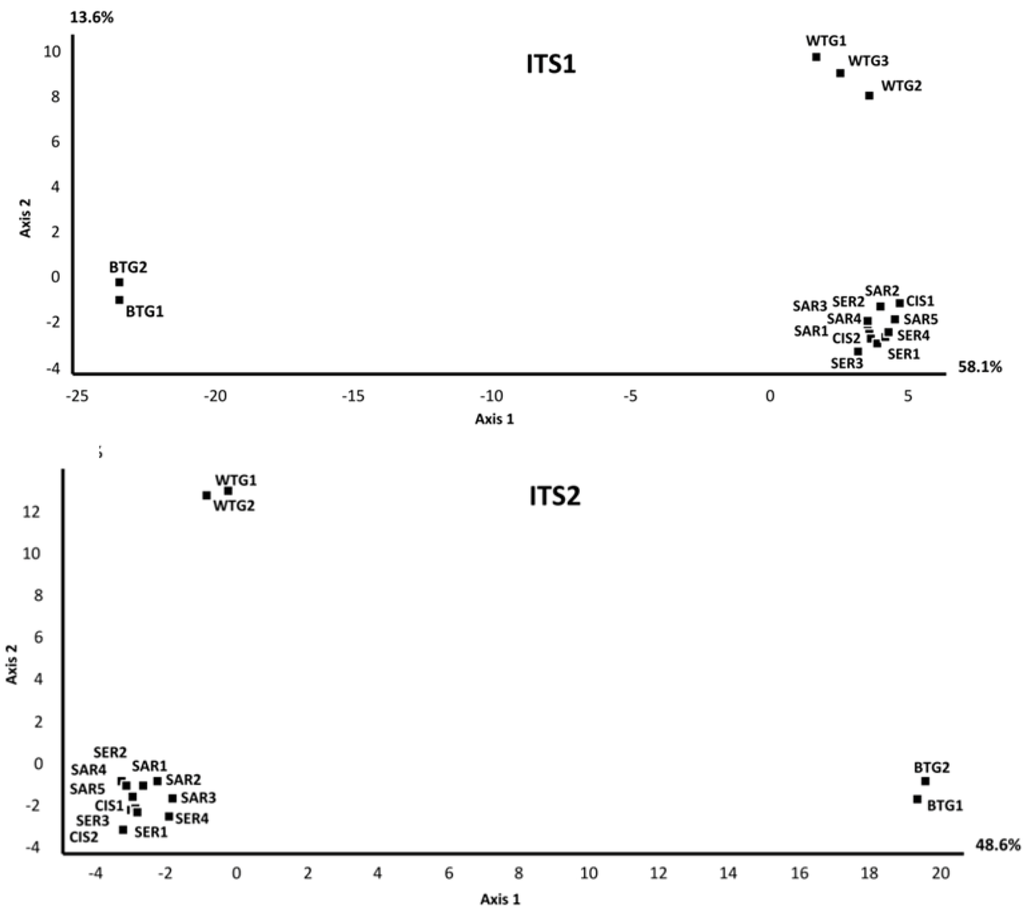 Principal Component Analysis of fungal assemblages in WTG (WTG 1-3), BTG (BTG 1-2), SAR (SAR 1-5), CIS (CIS 1-2) and SER (SER 1-4) soil samples, based on presence/absence data of ITS1 or ITS2 OTUs occurring in either all five soil sample groups or all samples within a group. Percentage variance values accounted for by the two first ordination axes are reported along each axis.