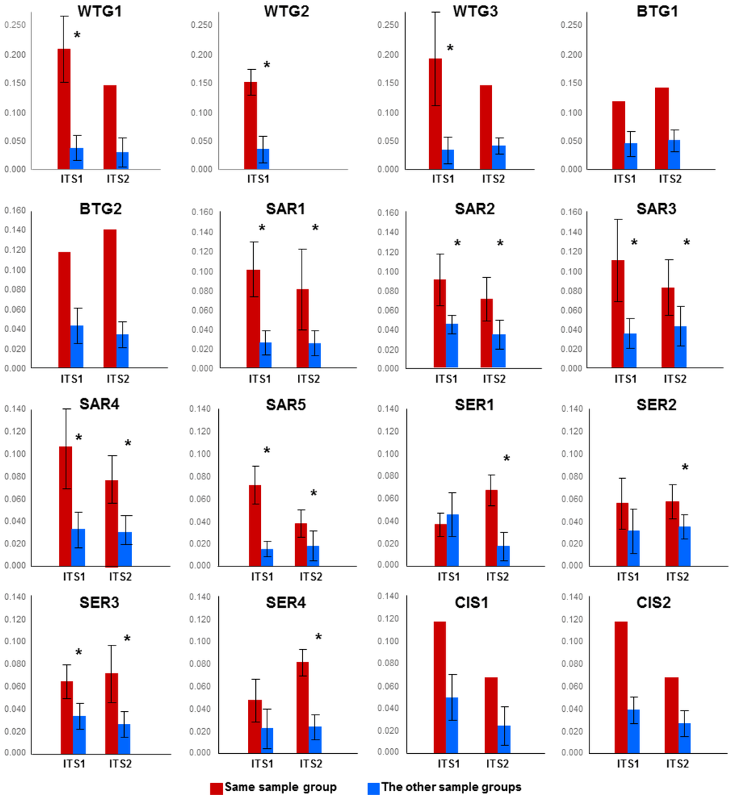 Pairwise Jaccard similarity indices between fungal communities from the same sample group or the other groups. For both ITS1 and ITS2, Jaccard indices were computed following rarefaction to 150 sequences per sample for both ITS1 and ITS2, to compare each fungal community with each of the other fungal communities from either the same sample group (blue columns) or the other groups (red columns). Mean values (columns) and standard deviations (bars) are reported for each comparison. Couples of columns marked with an asterisk indicate a significant difference between indices computed for intra-group pairwise comparisons and indices computed for inter-group pairwise comparisons (p < 0.05; Kruskal-Wallis test).