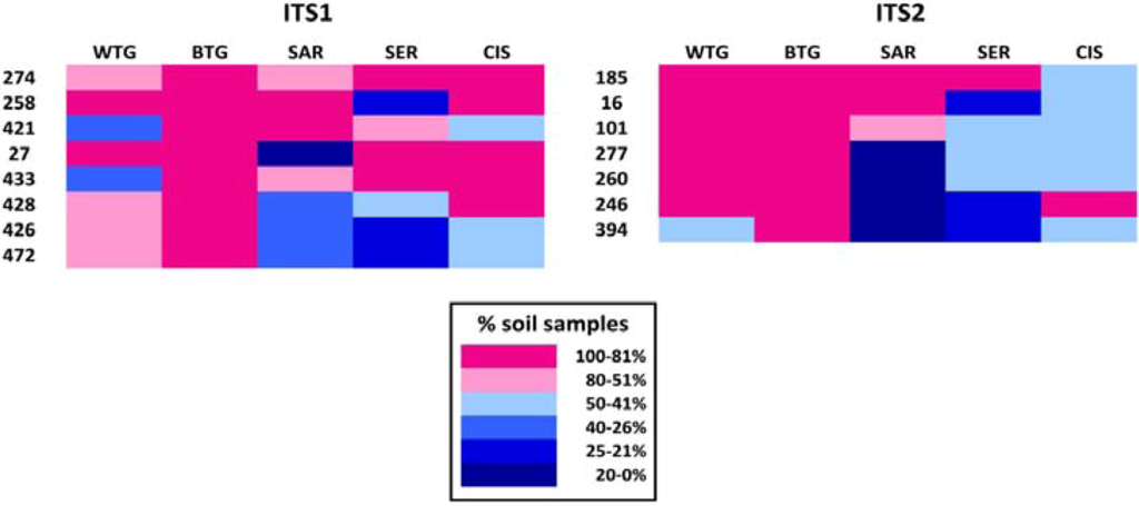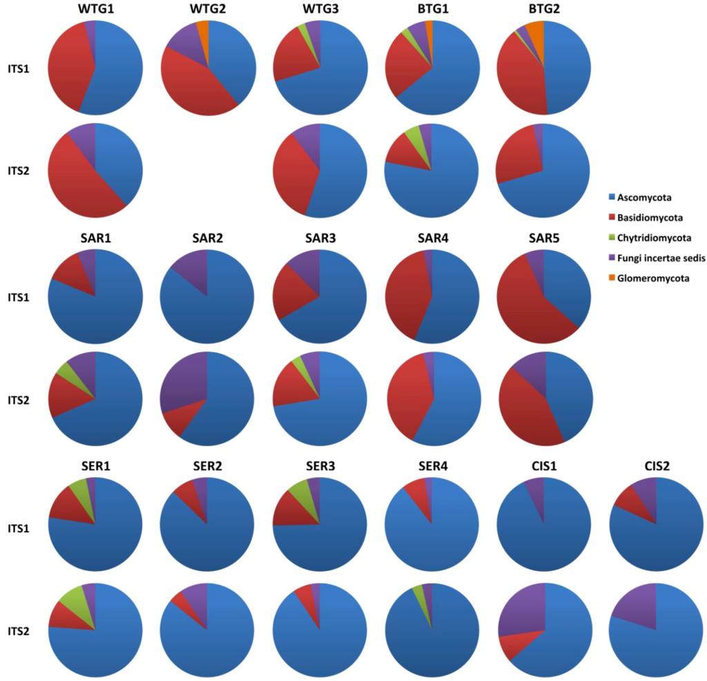 Comparison between the ITS1 and ITS2 datasets was performed following rarefaction to the same sequencing depth for both datasets (150 sequences per sample). Consistently, with its higher fungal specificity, the ITS1F/ITS2 primer pair yielded a lower number of non-fungal sequences than the ITS3/ITS4 primer pair (six and 269 sequences, respectively). The ITS1F/ITS2 primer pair is reported to be biased towards amplification of basidiomycetes [47]. However, such a bias was not consistently observed for the samples we amplified, as, for instance, no significant difference between the numbers of basidiomycetous sequences obtained with the ITS1F/ITS2 and the ITS3/ITS4 primers was observed for samples WTG1,3, BTG1, SAR2,5, SER2 and CIS2 (Supplementary Material 4).