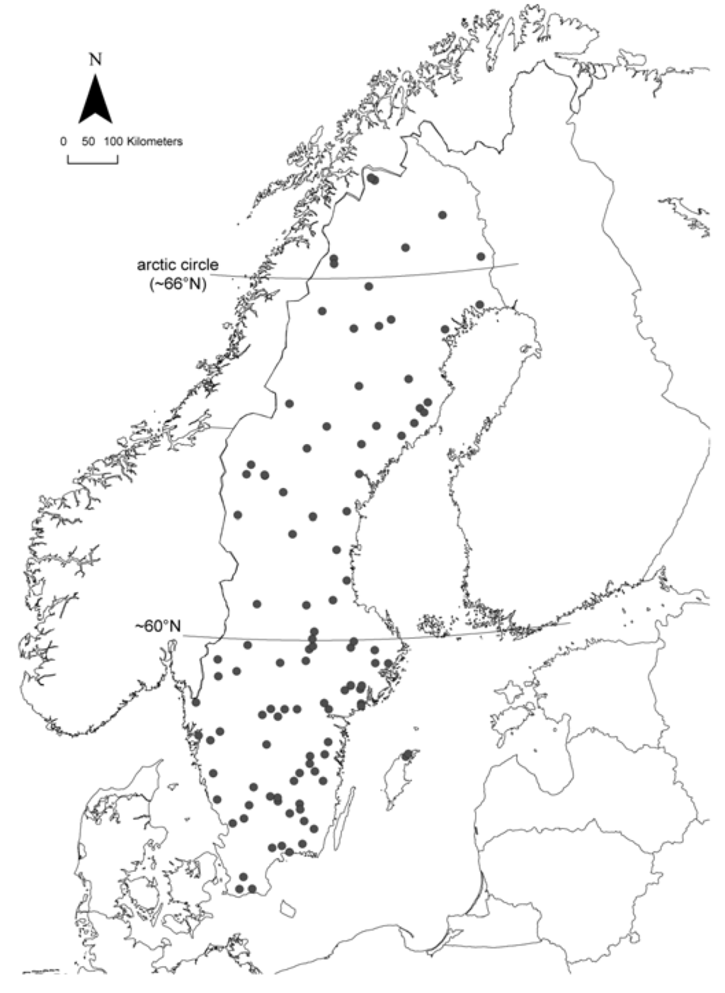 Map of Sweden showing the location of the lakes used in the study.