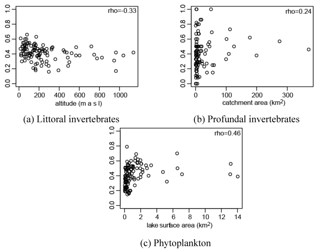 Examples of the significant correlations (Spearman correlation) between model accuracy expressed as true positive rate and geographical properties of study lakes: (a) littoral invertebrates and altitude, (b) profundal invertebrates and catchment area (two lakes with catchment area > 2000 km2 excluded did not affect the correlation analysis) and (c) phytoplankton and lake area (one lake with surface area of 52 km2 excluded did not affect the correlation analysis).