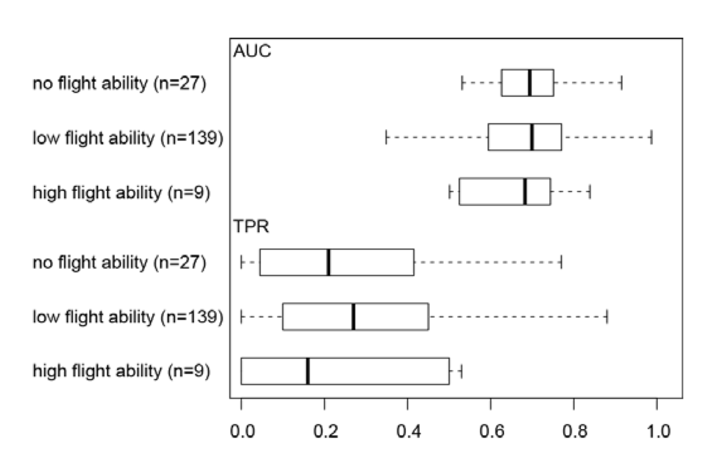 Boxplot of model accuracy (AUC and TPR) per taxon grouped according to their flight ability. No significant differences in mean values between the groups were found (t-test; p > 0.05).