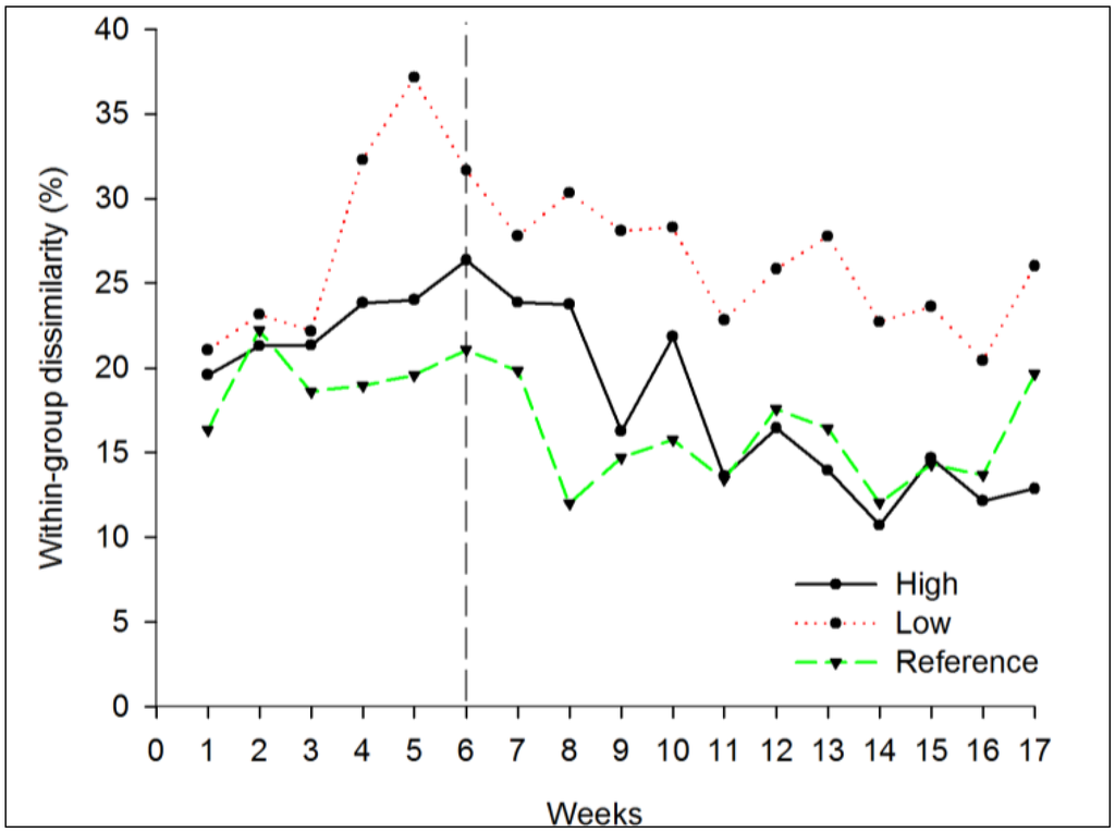 Within-group dissimilarity in rock pools disturbed by draining. The black vertical line represents the beginning of the disturbances. High = draining every diurnal low tide; Low = draining six times during the period, Reference = no draining. Note that high within-group dissimilarity is associated with high beta diversity.