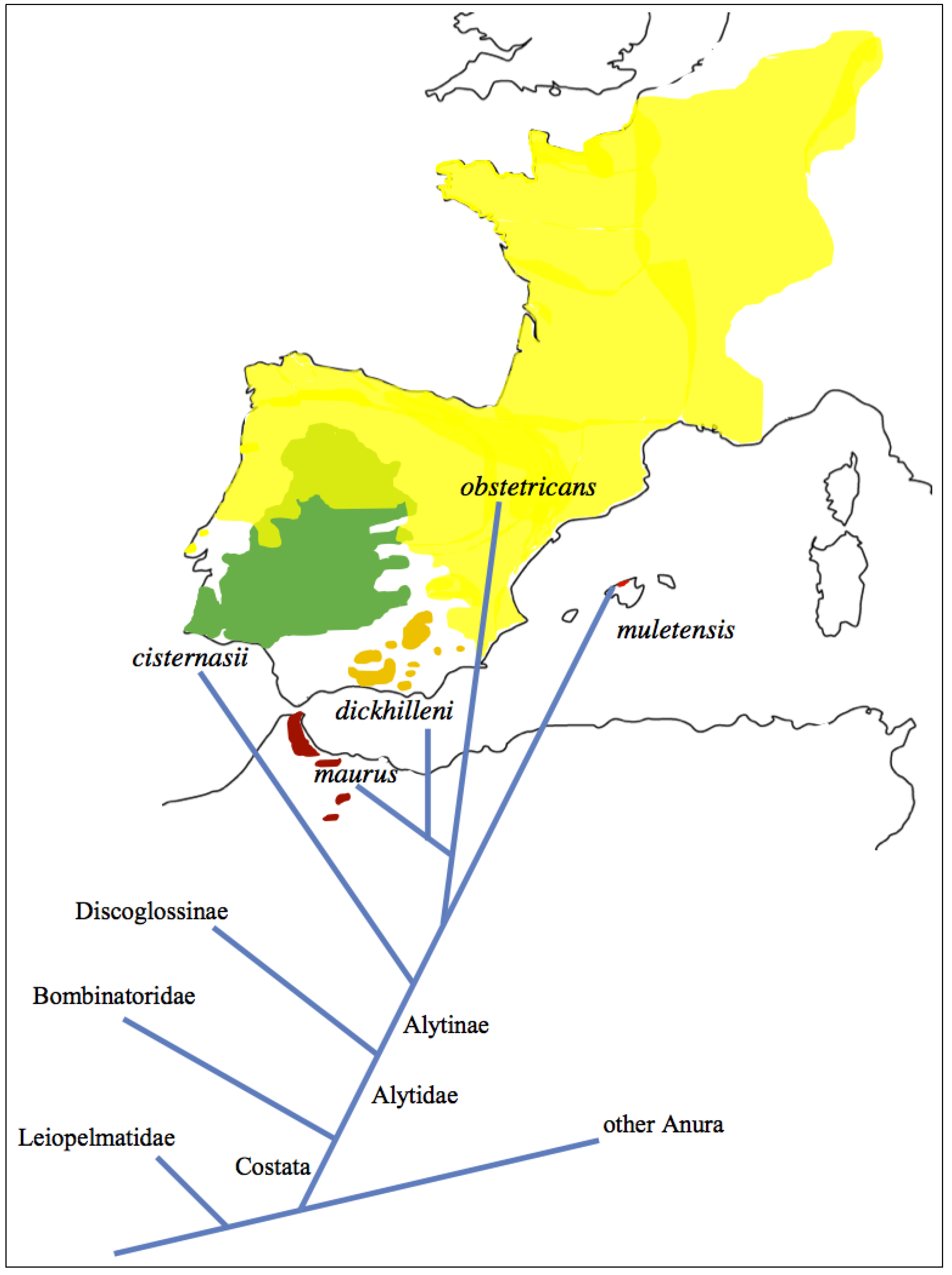 - Altaba, C.R. Phylogenetic relationships and biogeography of midwife toads (Anura: Alytinae): vicariance in a dynamic insular setting preceding adaptive radiation. 2014; unpublished work. [Google Scholar]