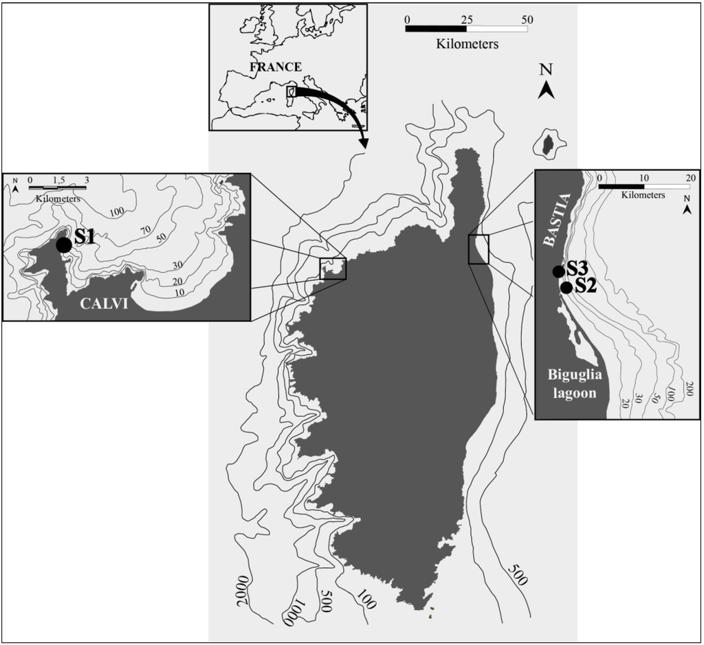 Location of Corsica Island, representation of the vertical asymmetry in bathymetric profile (according to French Navy’s Hydrographic and Oceanographic Department (SHOM) map, Western Mediterranean), and maps of the study areas giving station locations: S1, Bay of Calvi ; S2, littoral of Bastia, 1 km offshore and S3, littoral of Bastia, near the coast.