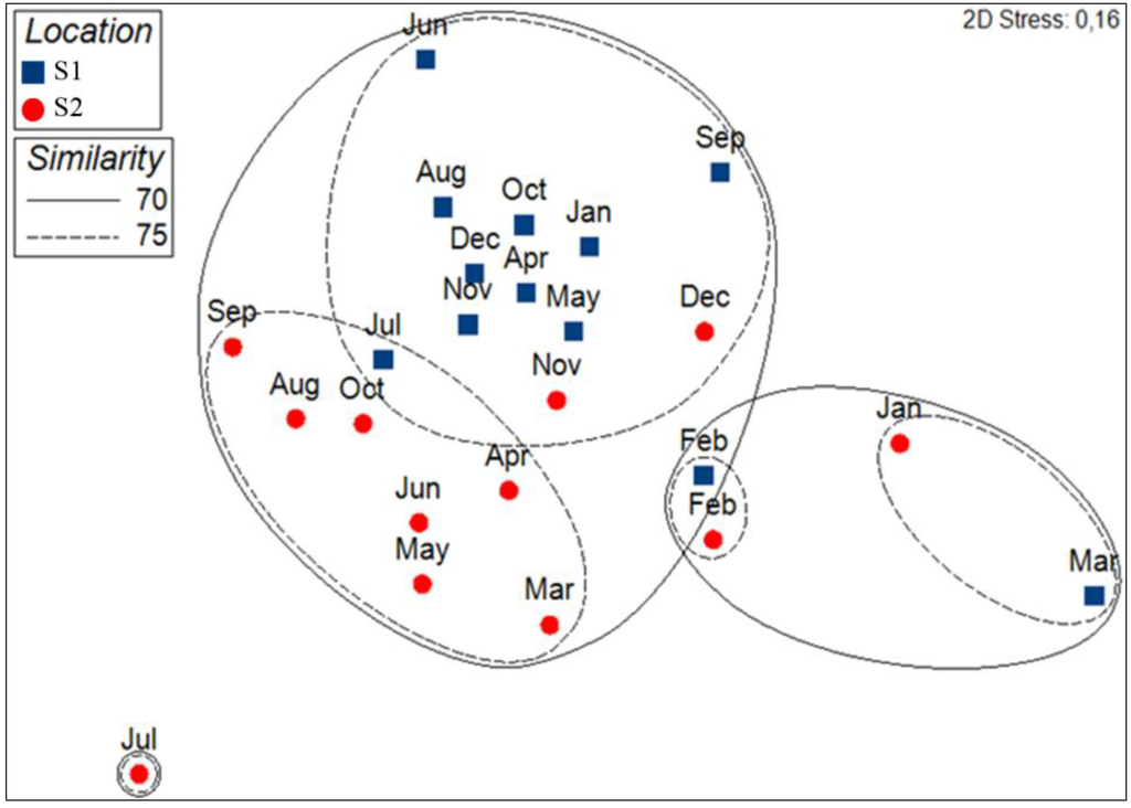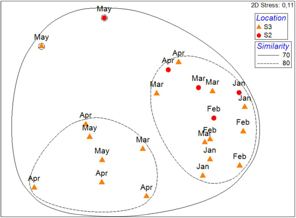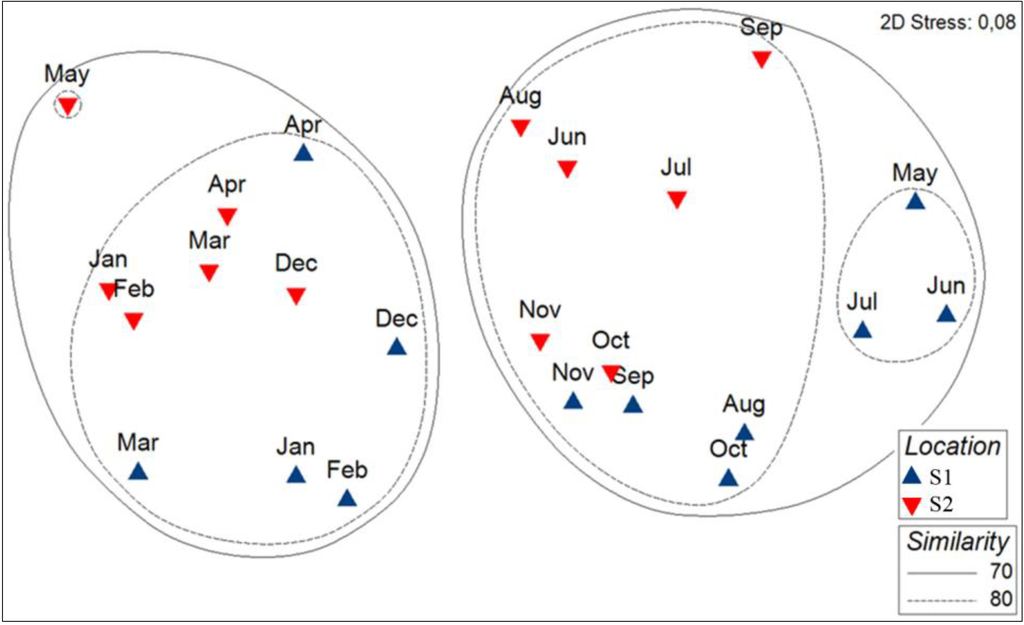 MDS revealed two principal groups, differentiating mainly the pigment assemblages of samples taken in winter/spring from those taken in summer/autumn at similarity threshold of 66% (Figure 6). It is to notice that the winter/spring cluster consisted of samples from January to April and December at S1, whereas it consisted of samples from January to May and December at S2.