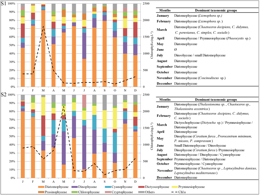 Spatio-temporal subsurface diversity of phytoplankton assemblages and Chl a variation, during 2010, at S1 and S2 stations (Ø no dominant taxonomic groups).