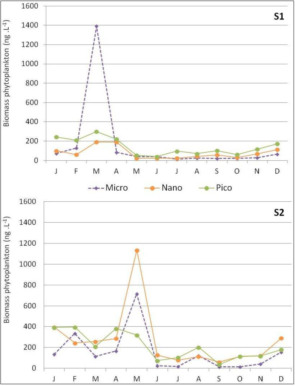 Spatio-temporal variability of biomass size classes for micro-, nano-, and picophytoplankton according to the equation of Vidussi et al. [40] at S1 and S2 stations.