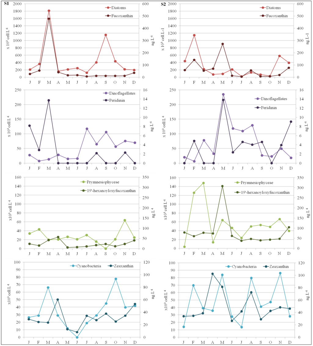 Spatio-temporal evolution of the principal classes of phytoplankton and the corresponding specific marker pigments at S1 and S2.