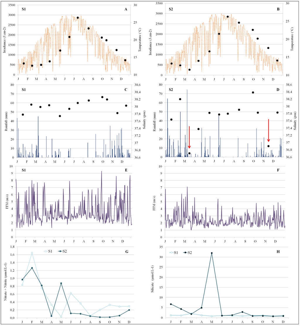 Temperature and salinity were measured at each sampling station in the subsurface (±1 m), using two multiparameter probes (Seabird SBE19 and YSI EMS, 6600 V2-2). Meteorological data for 2010 (mean daily irradiance in J·cm−2; daily mean wind velocity in m·s−1 and direction; daily rainfall precipitation in mm) came from Météo-France data recorded at the weather stations located in the Calvi and Bastia airports.