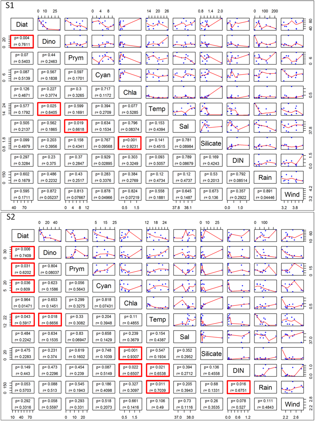 Abiotic drivers of phytoplankton assemblages in Bastia and Calvi—Pair-wise plots and spearman rank-correlations were first conducted to estimate the association between the measured chemical seawater parameters (temperature, salinity, DIN, silicate), meteorological data (wind, rain), and the principal classes of phytoplankton and the corresponding specific marker pigments.