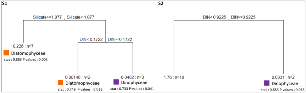 Distance based Multivariate Regression Trees (MRT) were then performed for both sites (S1 and S2) to define the habitat type (environmental parameters and their threshold values) associated with the different phytoplankton assemblage types isolated by each clusters. MRT is a constrained clustering method, reliable for analyzing community data without making any a priory assumption about the form of the relationship between the species matrix (in our study case, the classes of phytoplankton) and their environment [56]. The MRT were computed using a Bray–Curtis dissimilarity index.