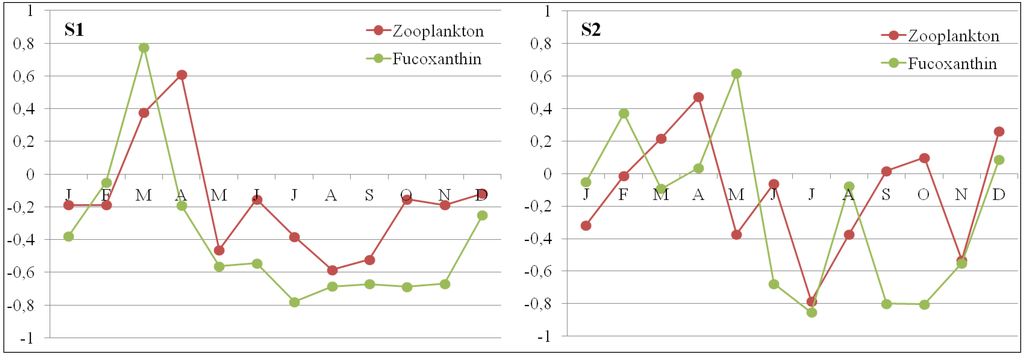 Succession between phytoplankton and zooplankton—Cross-correlations were performed between zooplankton bio-volumes and Chl a, and fucoxanthin, the specific marker of diatoms, to investigate the succession of zoo- and phytoplankton.