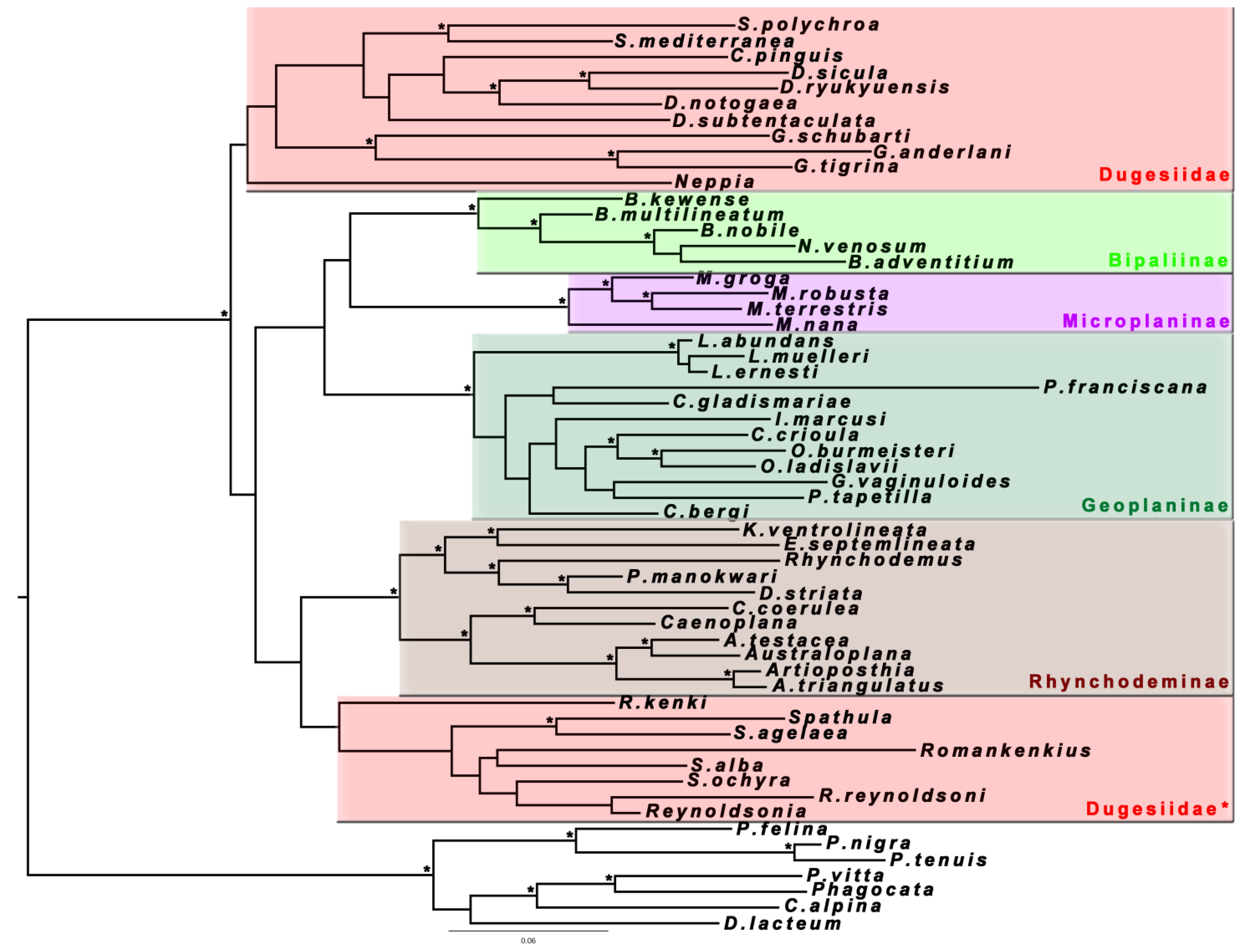 Maximum likelihood phylogenetic tree obtained from a concatenated dataset (18S rRNA type II, 28S rRNA and Elongation Factor 1α genes) for the Continenticola (see text). Terrestrial planarians: subfamilies Bipaliinae, Microplaninae, Geoplaninae and Rhynchodeminae; the freshwater Family Dugesiidae is polyphyletic; outgroup: Superfamily Planarioidea.