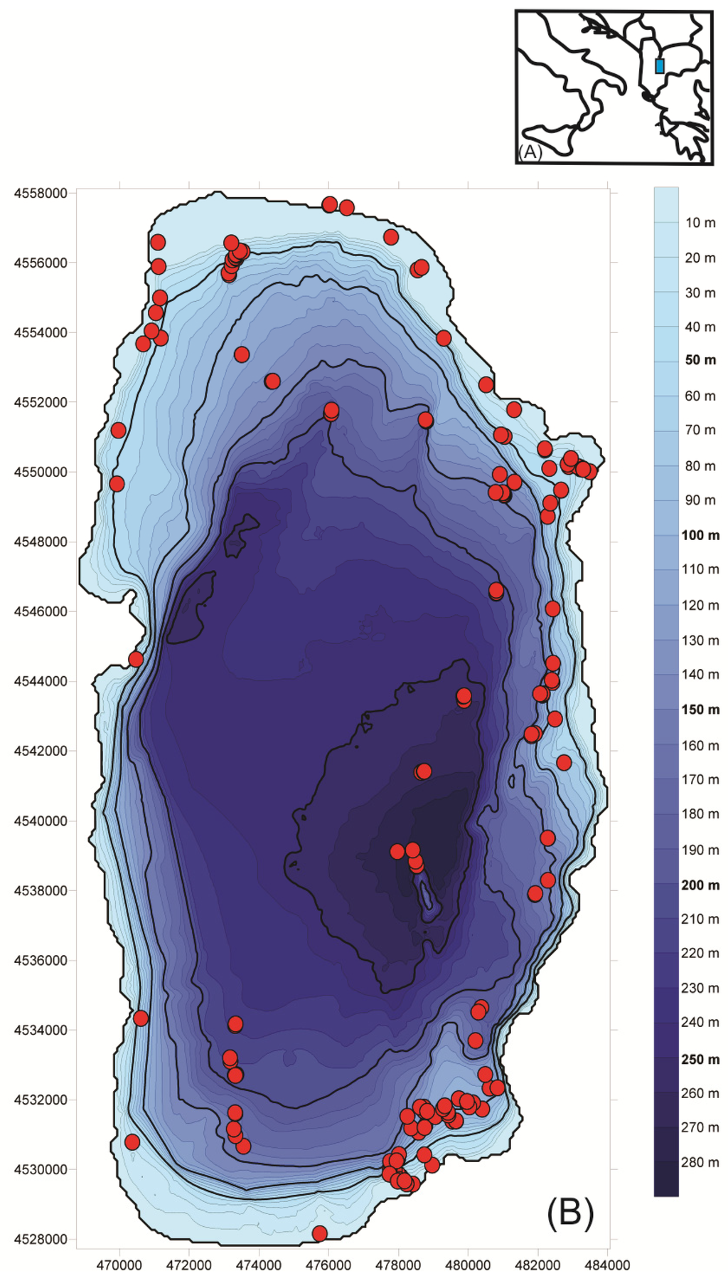 Ancient lakes possess long continental archives of past climate and environmental changes and are hotspots of biodiversity and speciation dynamics for endemic taxa [,,,,]. The Balkan region is a biogeographically diverse area characterized by ancient lakes. Besides well-known Lake Ohrid, Lakes Prespa, Skutari, Pamvotis, and Dojran are also ancient lakes [,,,]. Lake Ohrid hosts a highly diverse endemic freshwater fauna and flora []. Its geologic age and mode of formation remain controversial []. Lake Ohrid was selected for drilling by the International Continental Scientific Drilling Program (ICDP) because of its high potential as a paleoenvironmental and paleoclimatic archive []. Lake Ohrid possesses >220 endemic faunal species [], most belonging to the Amphipoda, Gastropoda, Isopoda, Ostracoda, Porifera, and Tricladida []. Stankovič [], Salemaa [], Frogley and Preece [], and Albrecht and Wilke [] suggested that 33 (63%) of the 52 described ostracode species from Lake Ohrid and its catchment are endemic. Petkovski (2005, unpubl. data) listed 41 species for Lake Ohrid proper, excluding the catchment. Early works on Ostracoda focused on taxonomy [,,,,,,,,,,] and there is little information on species ecological preferences, distribution within the lake, life cycles, or habitats. Mikulić and Pljakić [] published the only paper that presents the spatial distribution of one genus, Candona, in Lake Ohrid. Greatest Candona diversity occurred between 20 m and 50 m water depth.