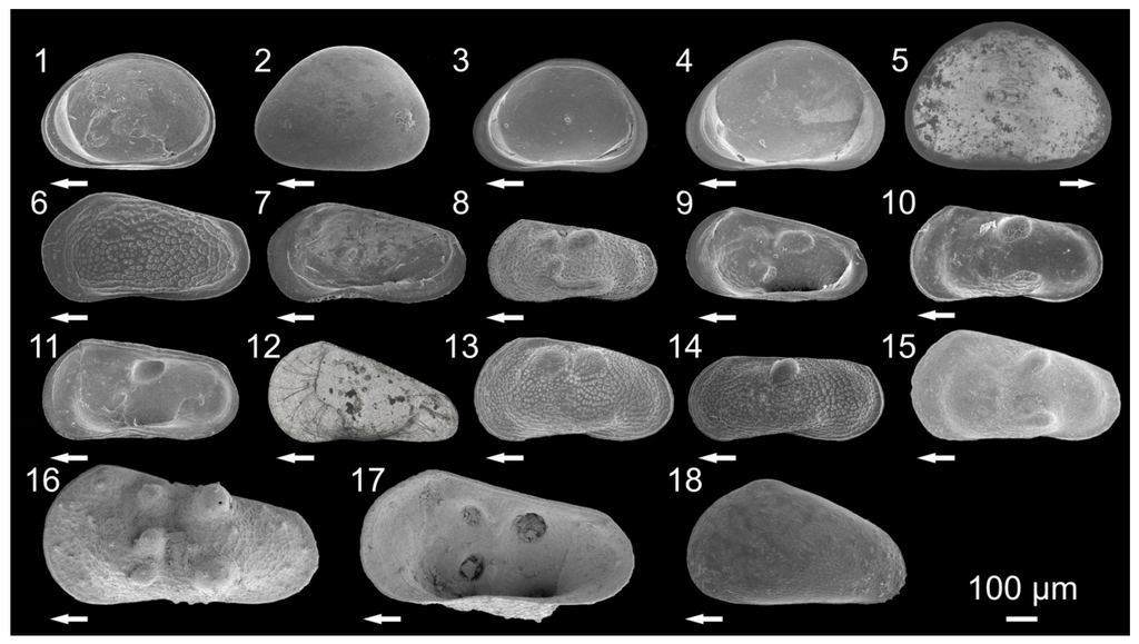 - Namiotko, T.; Danielopol, D.L.; Belmecheri, S.; Gross, M.; von Grafenstein, U. On the Leptocytheridae Ostracods of the Long-Lived Lake Ohrid: A Reappraisal of their Taxonomic Assignment and Biogeographic Origin. Int. Rev. Hydrobiol. 2012, 97, 356–374. [Google Scholar] [CrossRef]