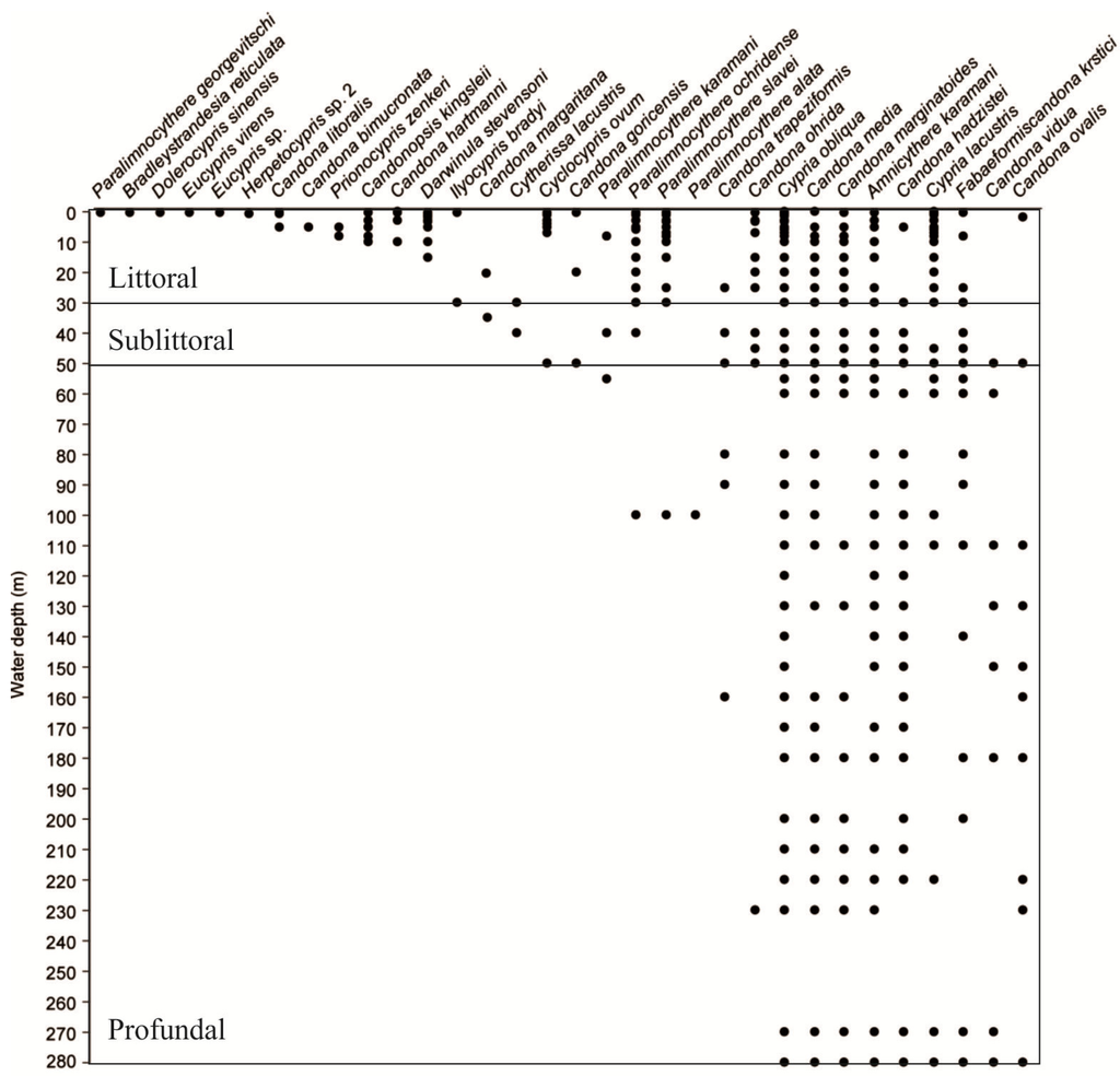Lake Ohrid is characterized by high ostracode species richness. The most speciose genus in the lake is Candona (12 living species) and the second most prominent genus is Paralimnocythere (five living species). The “young” ancient lake status was confirmed by the prevalence of species flocks of Limnocytherinae and Candonidae. Cypria lacustris displayed the highest abundances (2468 individuals 190 cm−3) among encountered species. Species abundances at 280 m water depth were relatively low, with highest values of 95 individuals 190 cm−3 (C. obliqua). Ostracode species living at 280 m water depth include C. obliqua, C. hadzistei, C. marginatoides, C. media, C. ovalis, C. vidua, F. krstici, C. lacustris, and A. karamani. Highest species richness was detected at 5 m water depth (15 species). Lower species richness in deep waters may reflect extreme environmental conditions (e.g., low oxygen content), and higher richness in the littoral zone may be a consequence of high O2 and diverse microhabitats. The water-depth distribution of ostracodes in the lake is probably a consequence of multiple interacting factors including oxygen concentration, water temperature, bottom substrate and food availability. In addition, ostracodes adapt to the environment by being mobile. Eight species were detected in the lake for the first time: C. bimucronata, I. bradyi, E. virens, Eucypris sp., P. zenkeri, B. reticulata, Herpetocypris sp. 2, and D. sinensis. These species and all the other cosmopolitan species found in the lake are restricted to water depths <50 m. However, given the increasing anthropogenic pressure on Lake Ohrid and the large tolerance ranges of some cosmopolitan species, we expect that endemic ostracodes will be progressively replaced by widespread species. The presence of A. karamani may be important for providing insights into the origin of Lake Ohrid. Although Amnicythere species usually inhabit oligo-haline to meso-haline waters, some species are marine, which may suggest a marine origin for the lake. Recent studies, however, indicate fluvial/glaciofluvial sedimentation at the onset of Lake Ohrid.