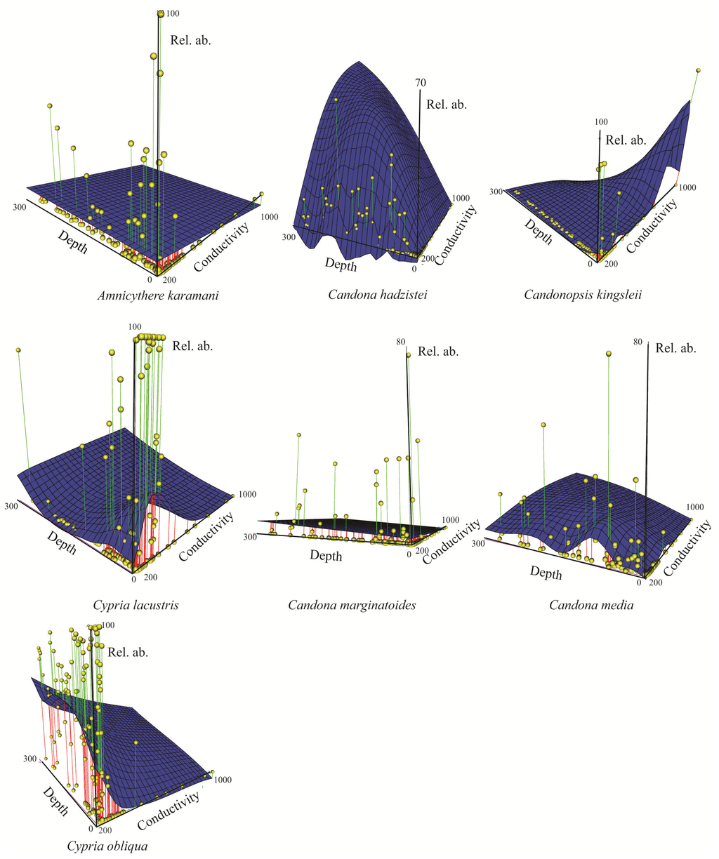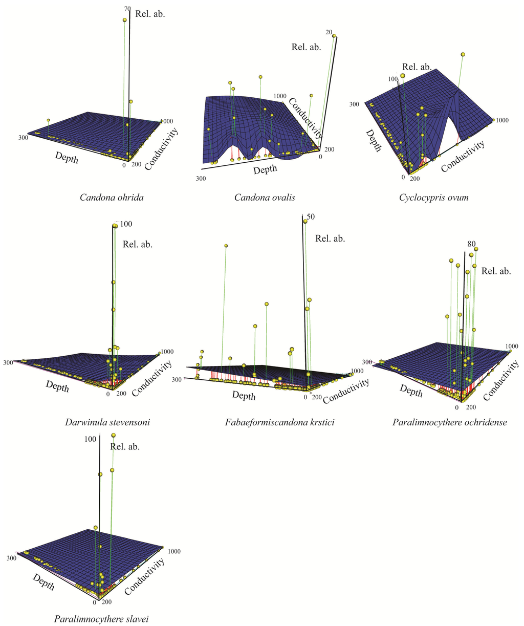 Figure 7 and Figure 8 display 3D plots of the relative abundance, water depth and conductivity data corresponding to the species collection sites. Our studies are the first in Lake Ohrid that sampled down to 280 m water depth [,]. We found that some species were restricted to littoral, sublittoral or profundal zones, whereas other species had wider distributions (littoral-sublittoral zones or littoral-profundal zones, Figure 6, Figure 7 and Figure 8).