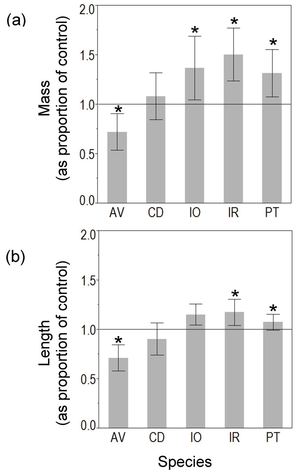 Effects of grazer species on eelgrass (a): mass and (b) shoot length at the end of Phase 1 of the mesocosm experiment. Error bars are 95% CI. Asterisks indicate significant effects as determined by confidence intervals that do not overlap with the control value of 1. Species and sample sizes were AV = Ampithoe valida (n = 26), CD = Caprella drepanochir (n = 23), IO = Ilyanassa obsoleta (n = 23), IR = Idotea resecata (n = 26), and PT = Phyllaplysia taylori (n = 24).