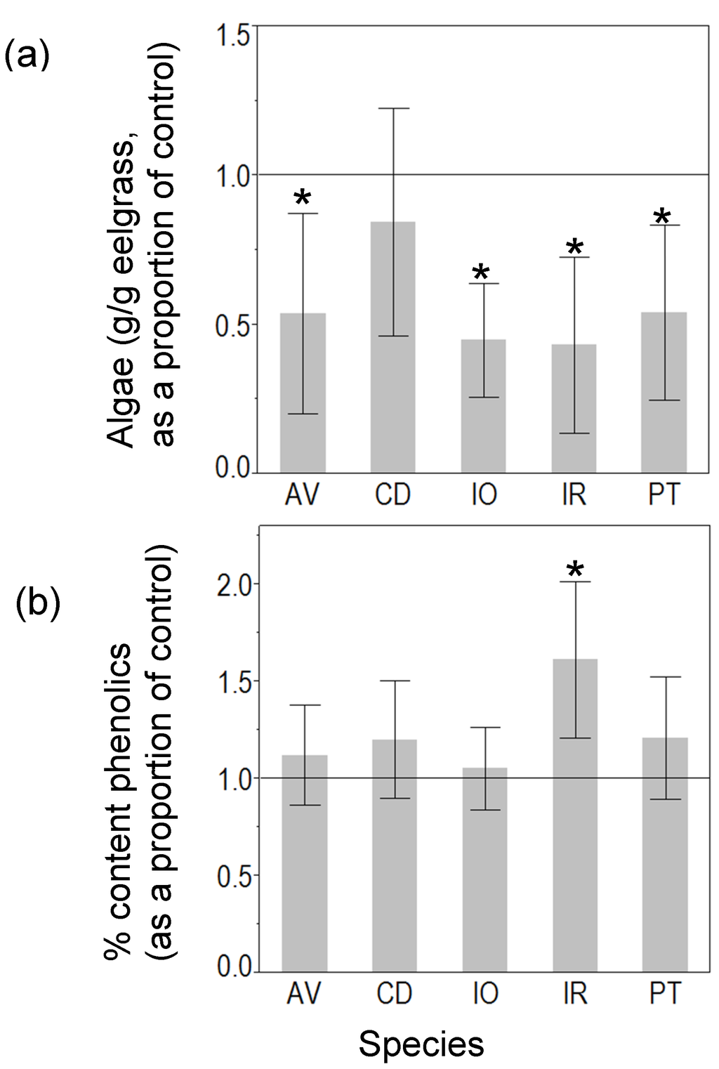 Effects of grazer species on (a) epiphytic algae mass per mass of eelgrass and (b) eelgrass phenolic content, as a proportion of the control, at the end of Phase 1 of the mesocosm experiment. Species abbreviations and error bars as in Figure 1. Untransformed algae data are shown in (a) but significance (*) was determined on log-transformed data in comparison to the log-transformed control value of zero: AV (95% CI: −1.9103–−0.7433, n = 19), CD (95% CI: −1.2749–0.0049, n = 18), IO (95% CI: −1.7691–−0.7167, n = 18), IR (95% CI: −1.9702–−0.9591, n = 20), and PT (95% CI: −1.8273–−0.5038, n = 17). Similarly, untransformed phenolic concentration data are shown in (b) but significance (*) was determined on log-transformed data: AV (95% CI: −0.2551–0.1921, n = 26), CD (95% CI: −0.2141–0.2861, n = 22), IO (95% CI: −0.2004–0.1406, n = 23), IR (95% CI: 0.1336–0.5441, n = 26), and PT (95% CI: −0.1799–0.2587, n = 26). In both cases, the untransformed data showed the same patterns.