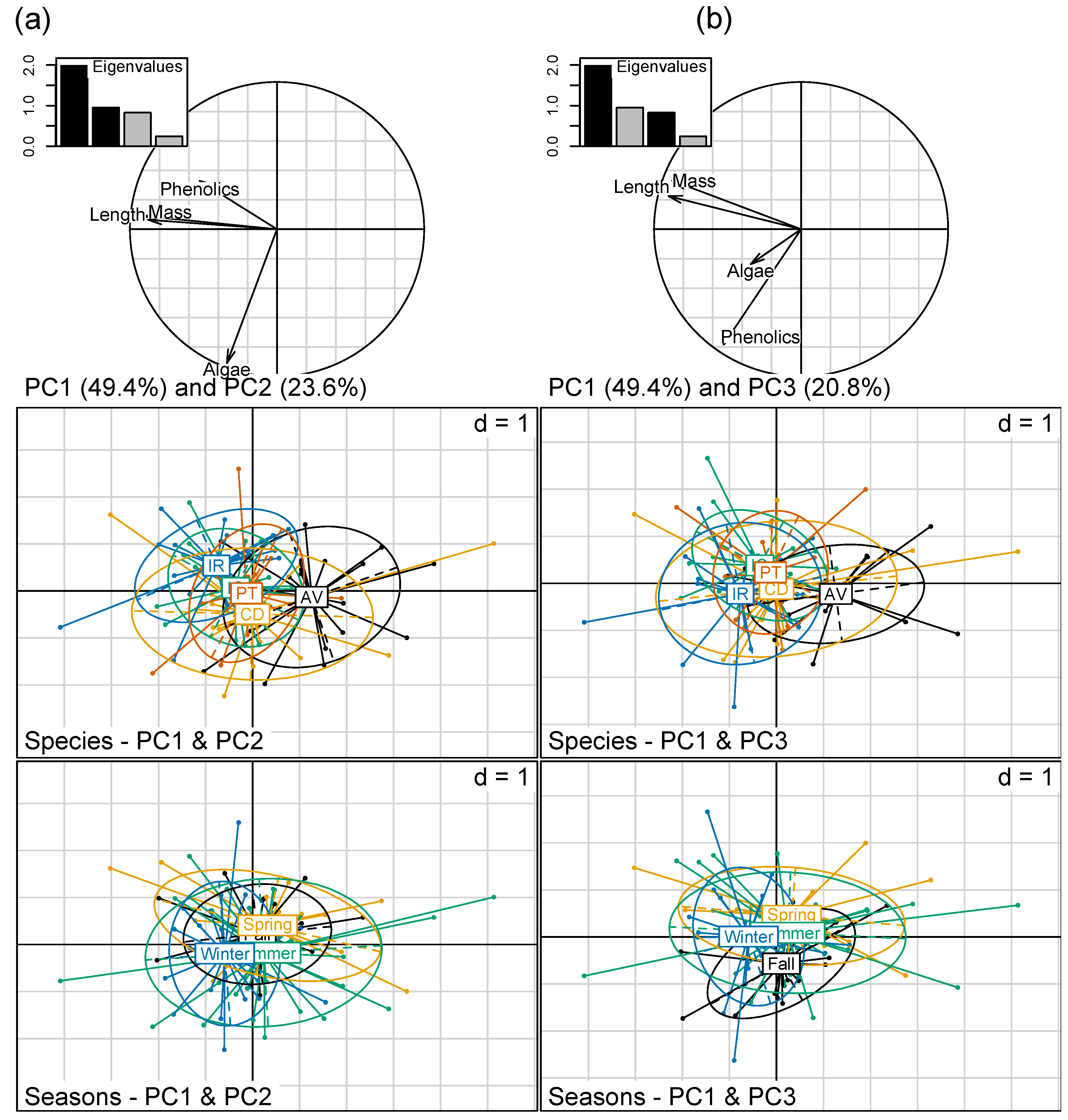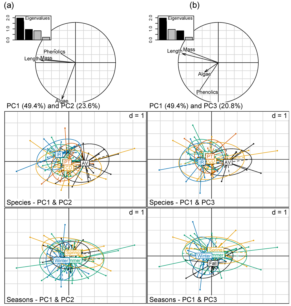 Results of Principal Components Analysis following Phase 1 of the mesocosm experiment. In (a) Principal Component (PC) 1 is negatively correlated with eelgrass length and mass and PC 2 is negatively correlated with epiphytic algal mass. In (b) PC 3 is negatively correlated with phenolic concentration. The lower plots show the data color coded by species (abbreviations as in Figure 1) or seasons. Ellipses grouping the data encompass ~67% of the points.