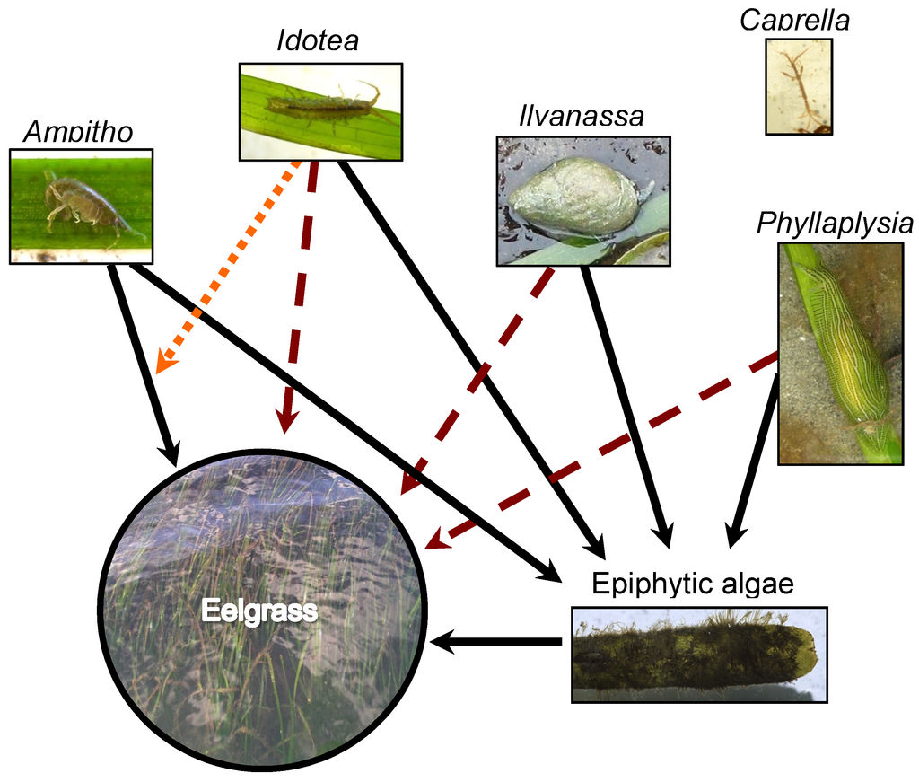 Conceptual diagram of interactions among grazer species, eelgrass, and epiphytic algae as observed in the mesocosm experiment. Solid black lines indicate a negative effect of one species on another. Dashed red lines indicate an indirect positive effect of one species on another. The dotted orange line indicates the reduction in Ampithoe’s negative effects on eelgrass with Idotea present, which may be mediated by Idotea-induced changes in eelgrass palatability. All photos by the authors. Organisms not shown to scale.