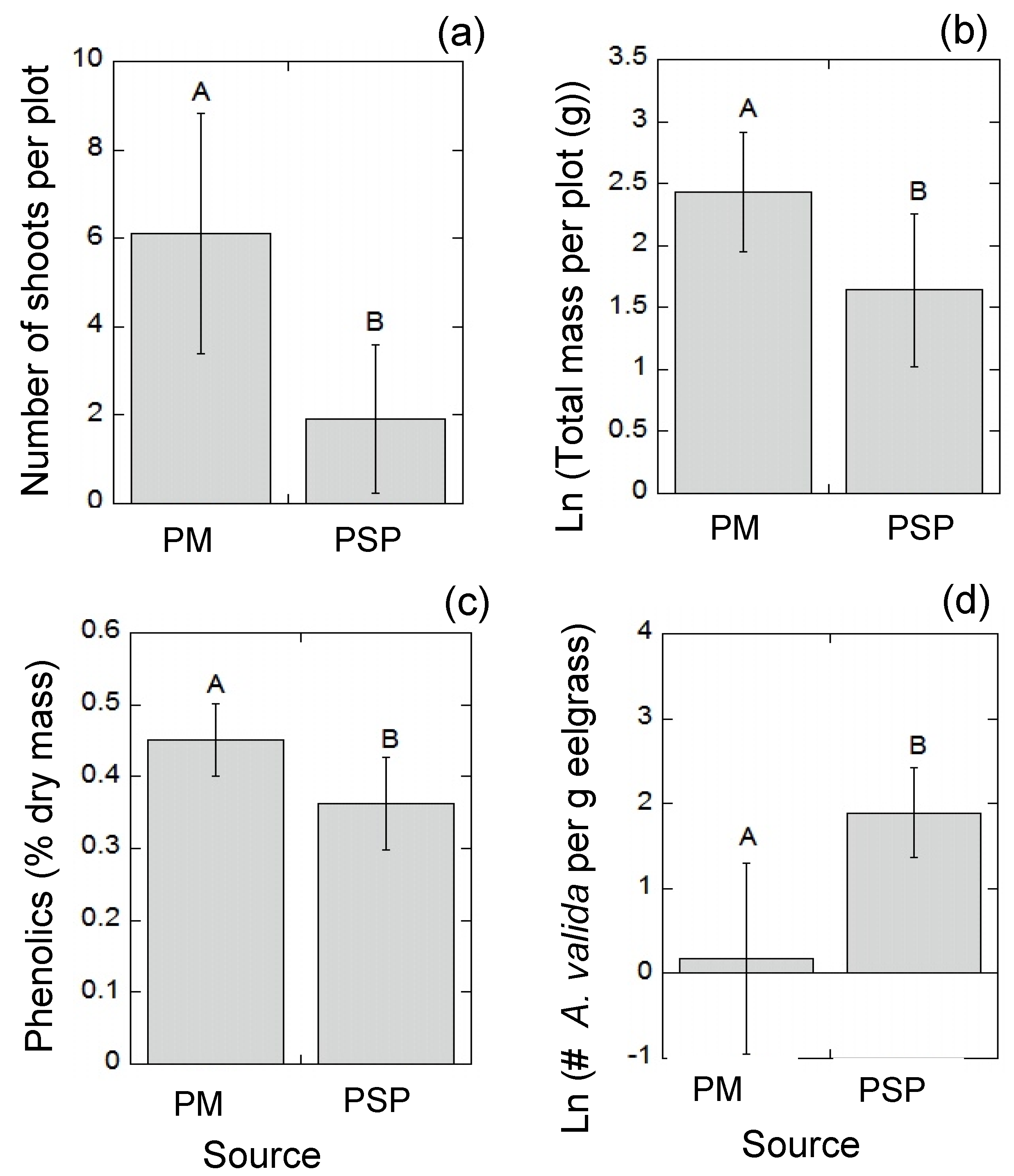 Effects of eelgrass source in the field experiment on eelgrass (a): shoot density, (b) dry mass, (c) total phenolic concentration, and (d) abundance of Ampithoe valida. Error bars are 95% confidence intervals. Different letters indicate statistically significant differences. Sources were PM = Point Molate and PSP = Point San Pablo. n = 10 except for PSP in (b–d), where n = 5 (only those plots with surviving shoots).